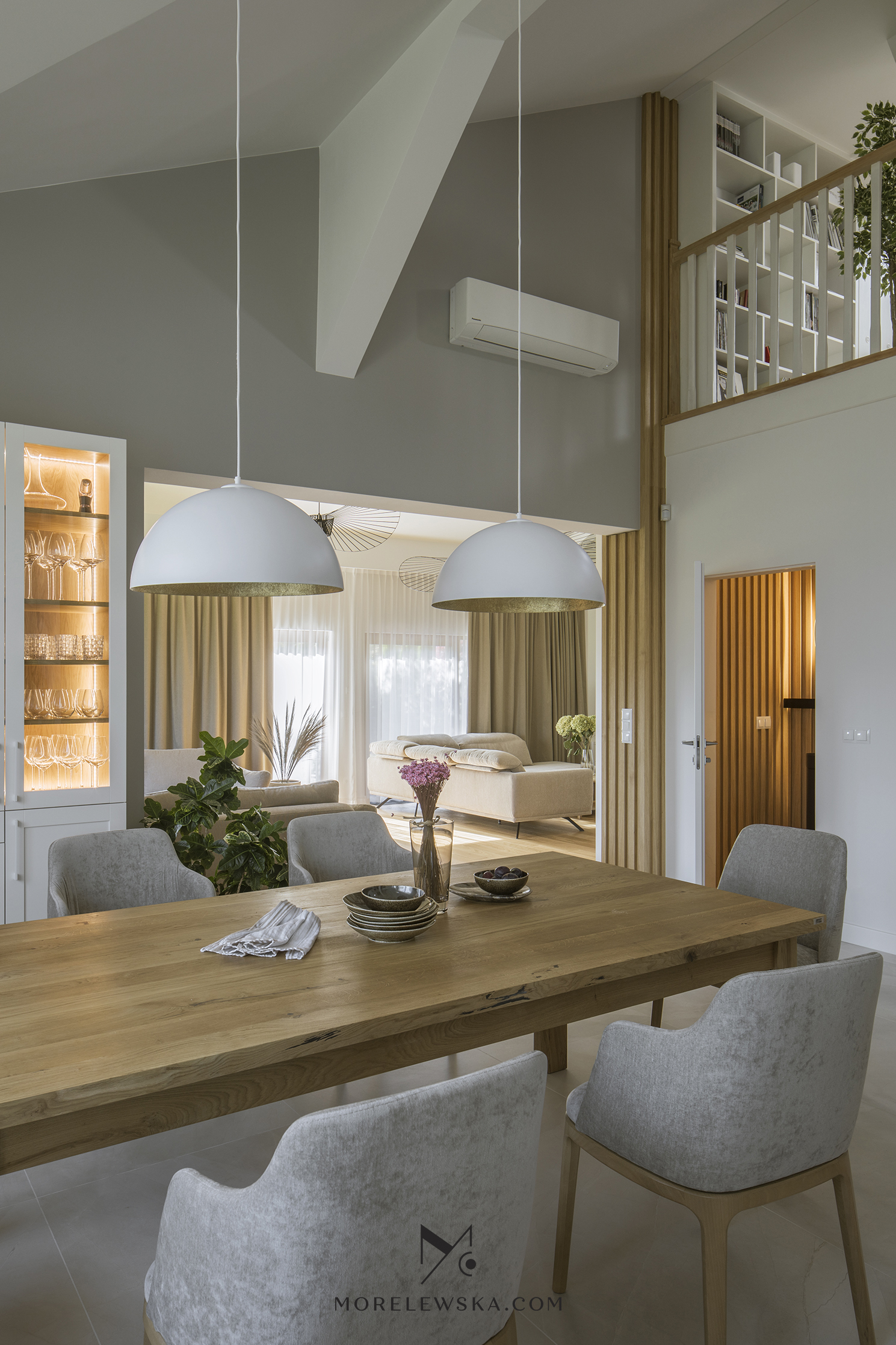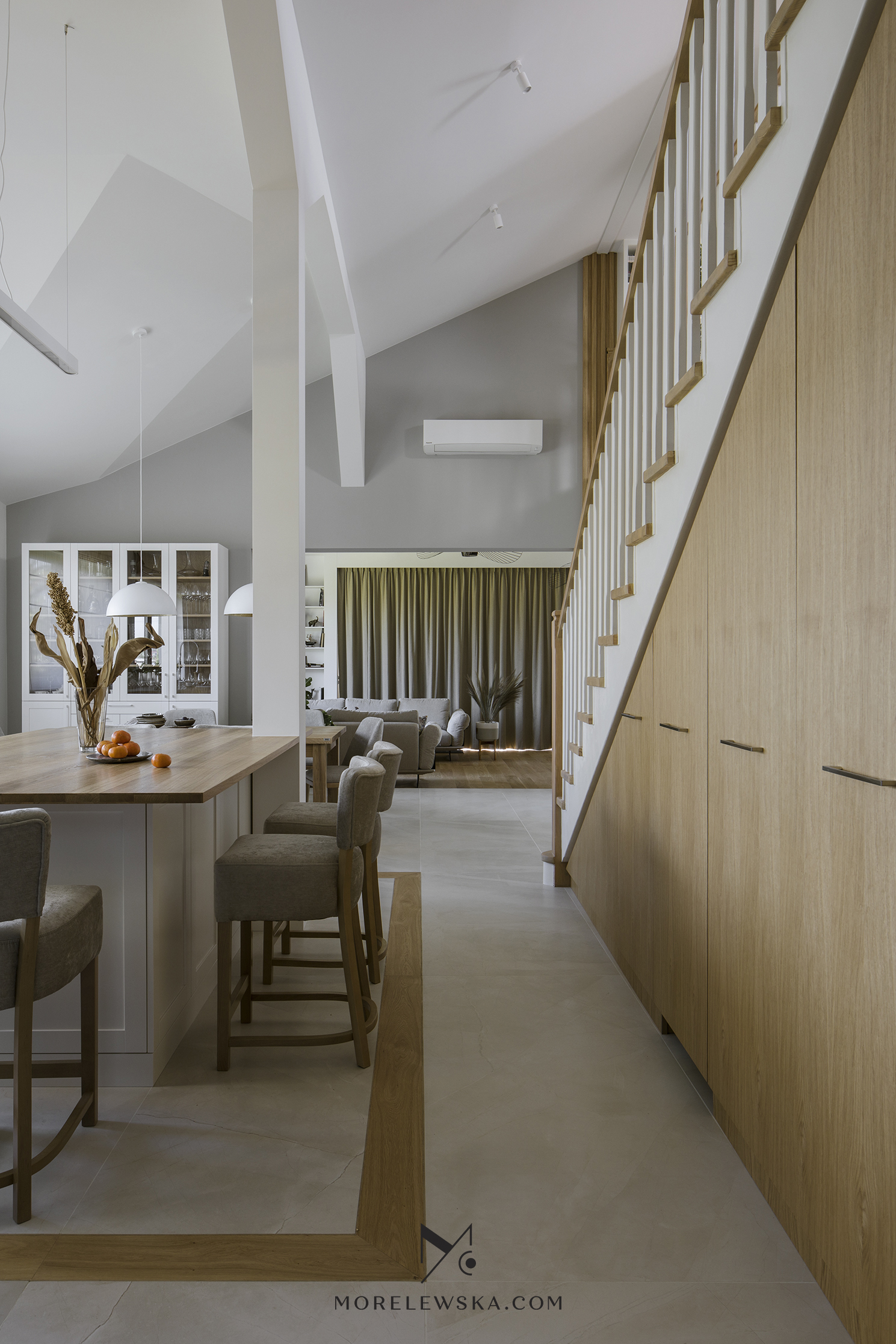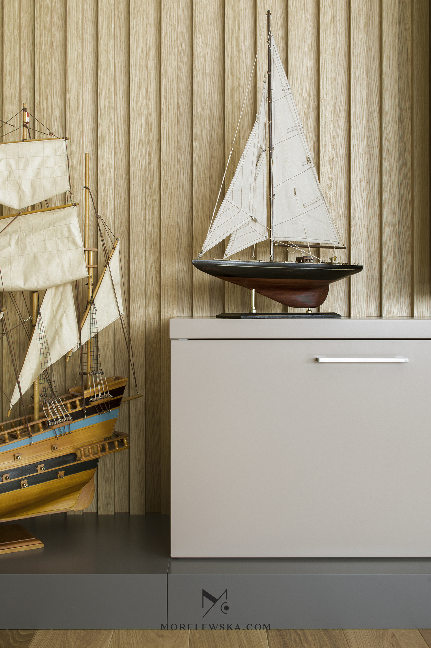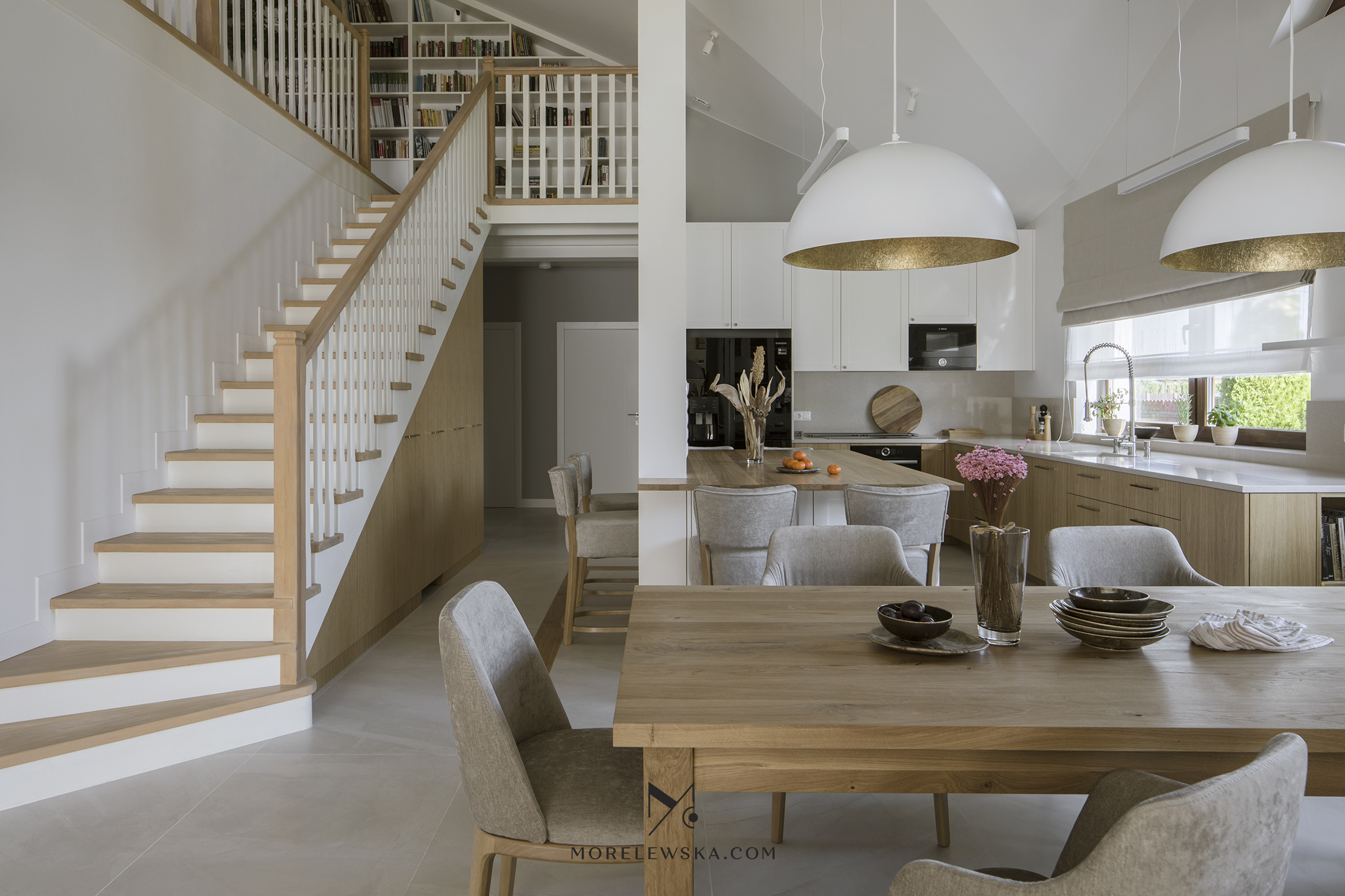 Dom stworzony specjalnie dla miłośników morskich głębin, chociaż wyraźnie zaakcentowane motywy marynistyczne nie dominują przestrzeni. Są jak drugoplanowi bohaterowie – bez nich wnętrze nie byłoby tak wymowne, ale zachowałoby swój pierwotny, kameralny klimat. Jasna, stonowana kolorystyka ocieplona naturalnym drewnem sprawia, że dom pomimo tego, że jest bardzo przestronny, zachowuje przytulny i pełen ciepła charakter. Lamele, dywany, poduszki, koce, świece i oświetlenie czynią to wnętrze jedynym w swoim rodzaju. Z antresoli, w której mieści się siłownia, domownicy mogą obserwować domowe rytuały tych, którzy relaksują się w strefie dziennej albo akurat przyrządzają posiłek.