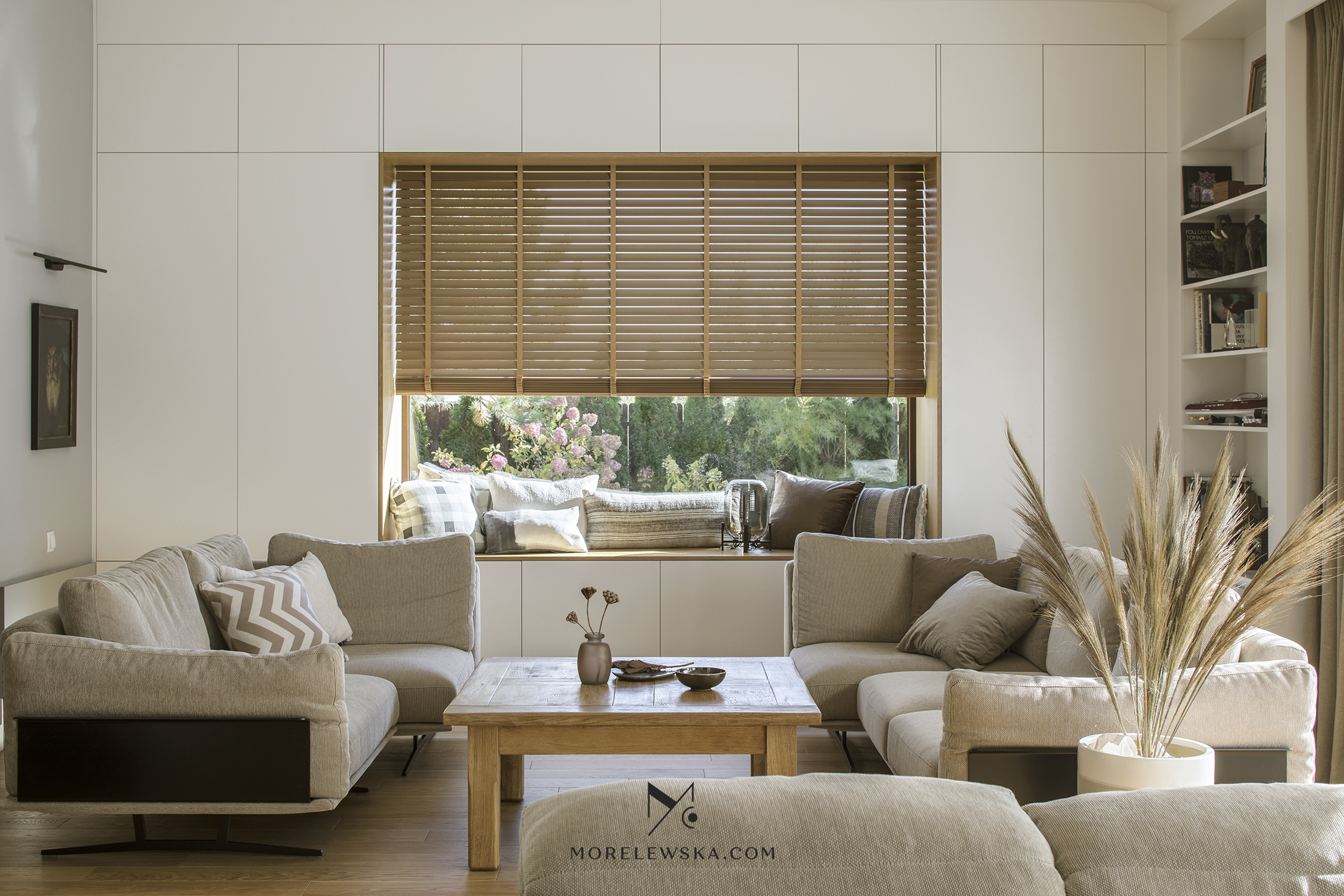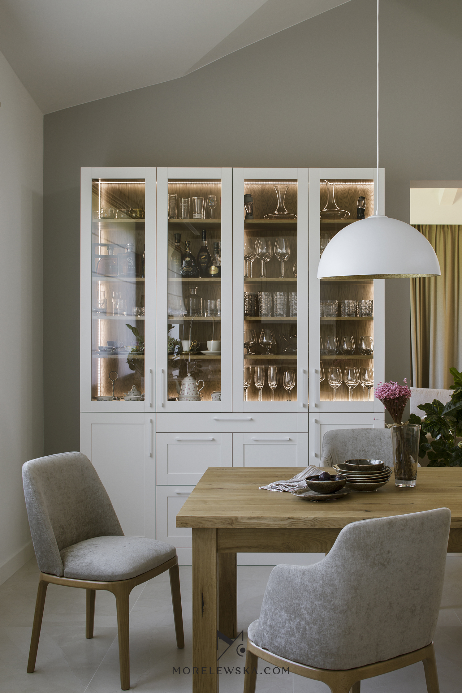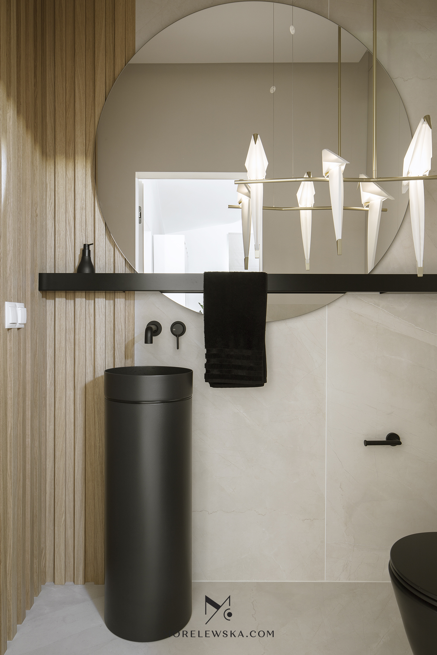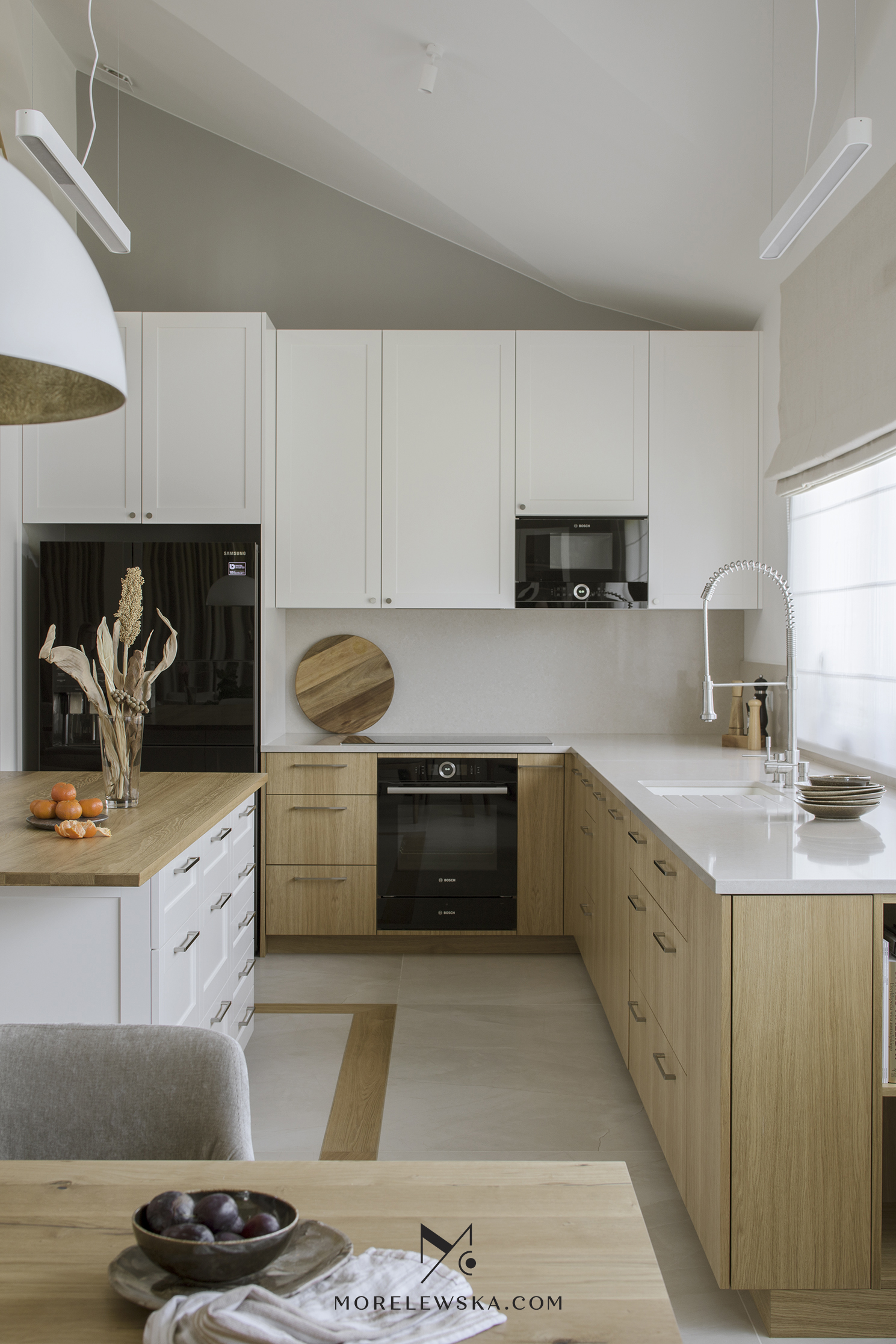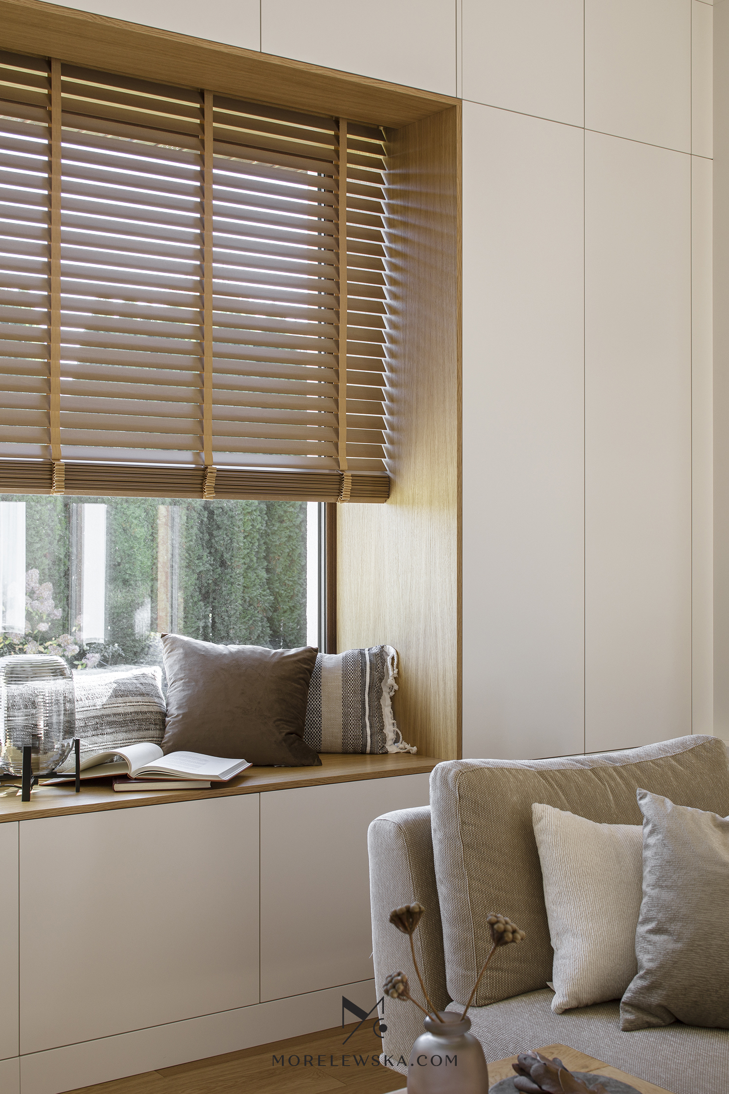 Dom stworzony specjalnie dla miłośników morskich głębin, chociaż wyraźnie zaakcentowane motywy marynistyczne nie dominują przestrzeni. Są jak drugoplanowi bohaterowie – bez nich wnętrze nie byłoby tak wymowne, ale zachowałoby swój pierwotny, kameralny klimat. Jasna, stonowana kolorystyka ocieplona naturalnym drewnem sprawia, że dom pomimo tego, że jest bardzo przestronny, zachowuje przytulny i pełen ciepła charakter. Lamele, dywany, poduszki, koce, świece i oświetlenie czynią to wnętrze jedynym w swoim rodzaju. Z antresoli, w której mieści się siłownia, domownicy mogą obserwować domowe rytuały tych, którzy relaksują się w strefie dziennej albo akurat przyrządzają posiłek.