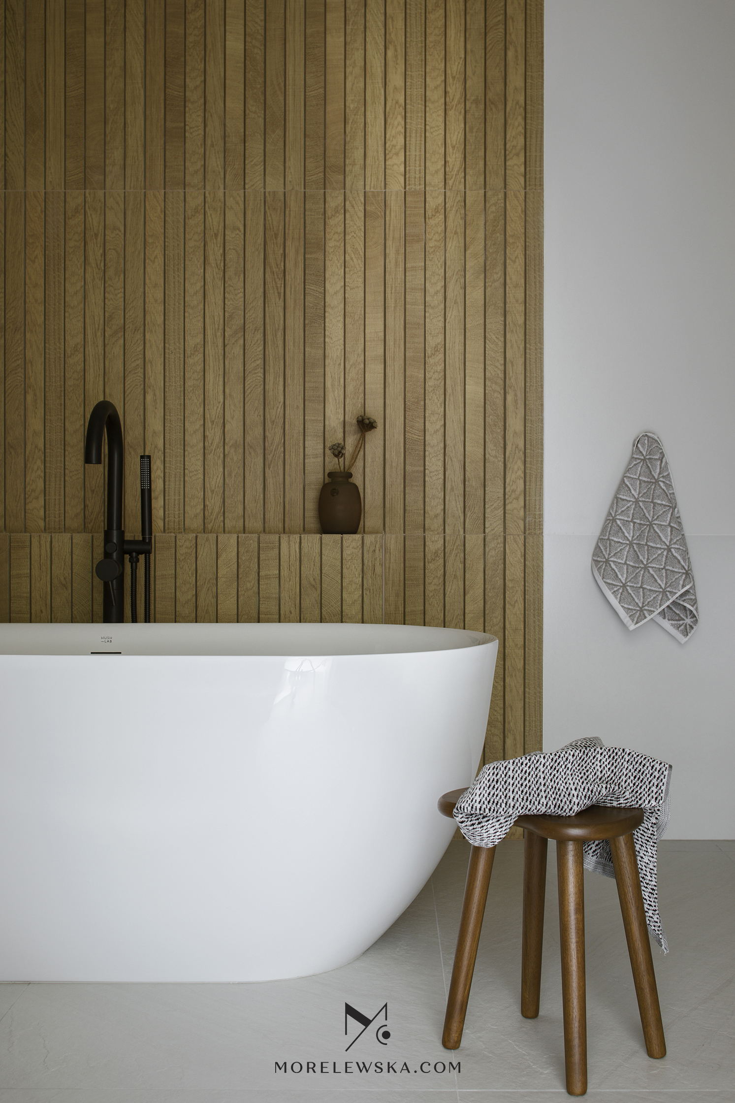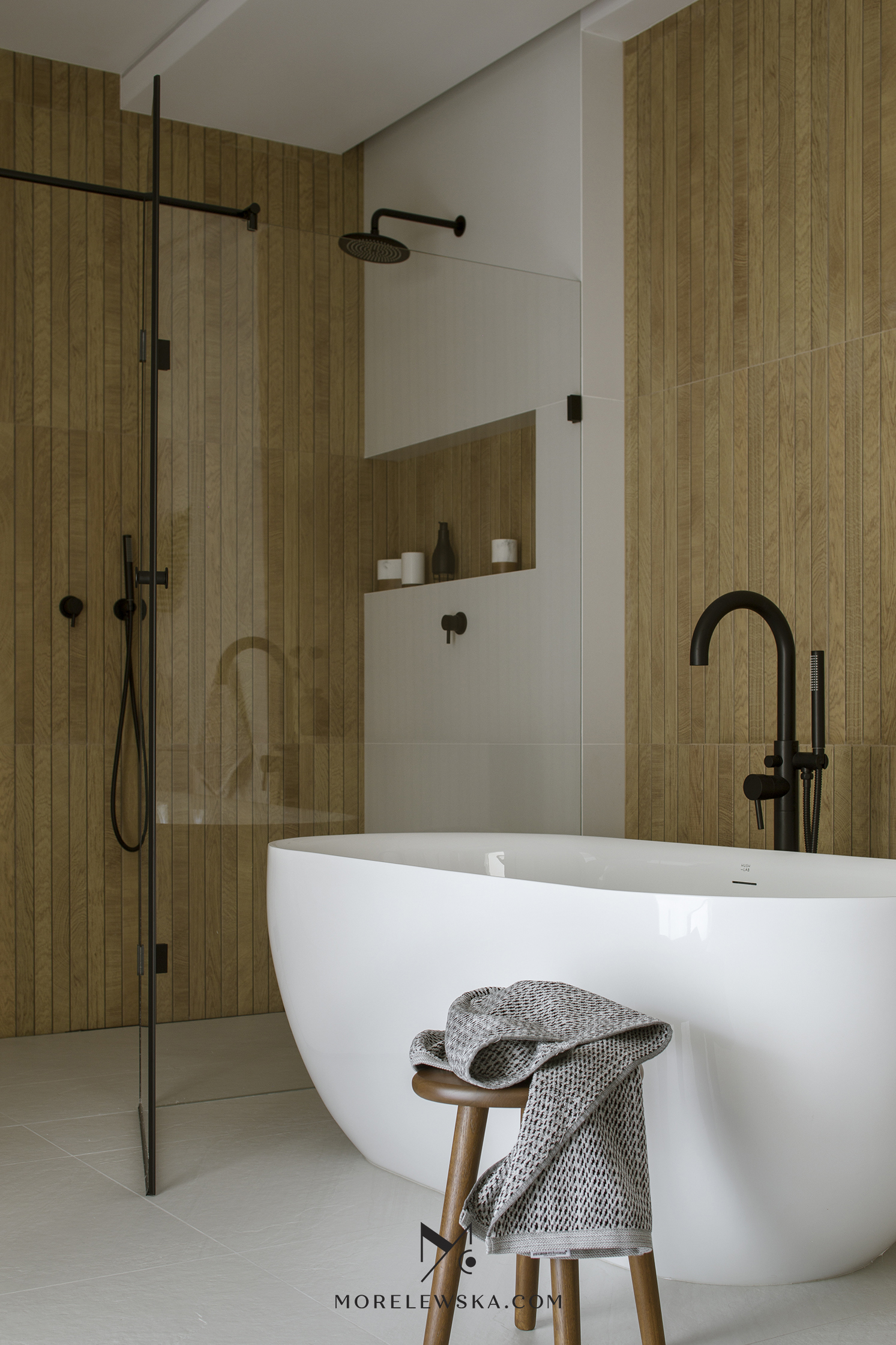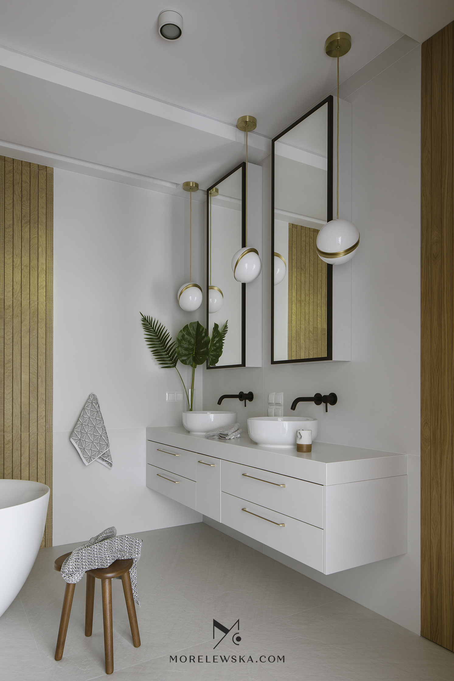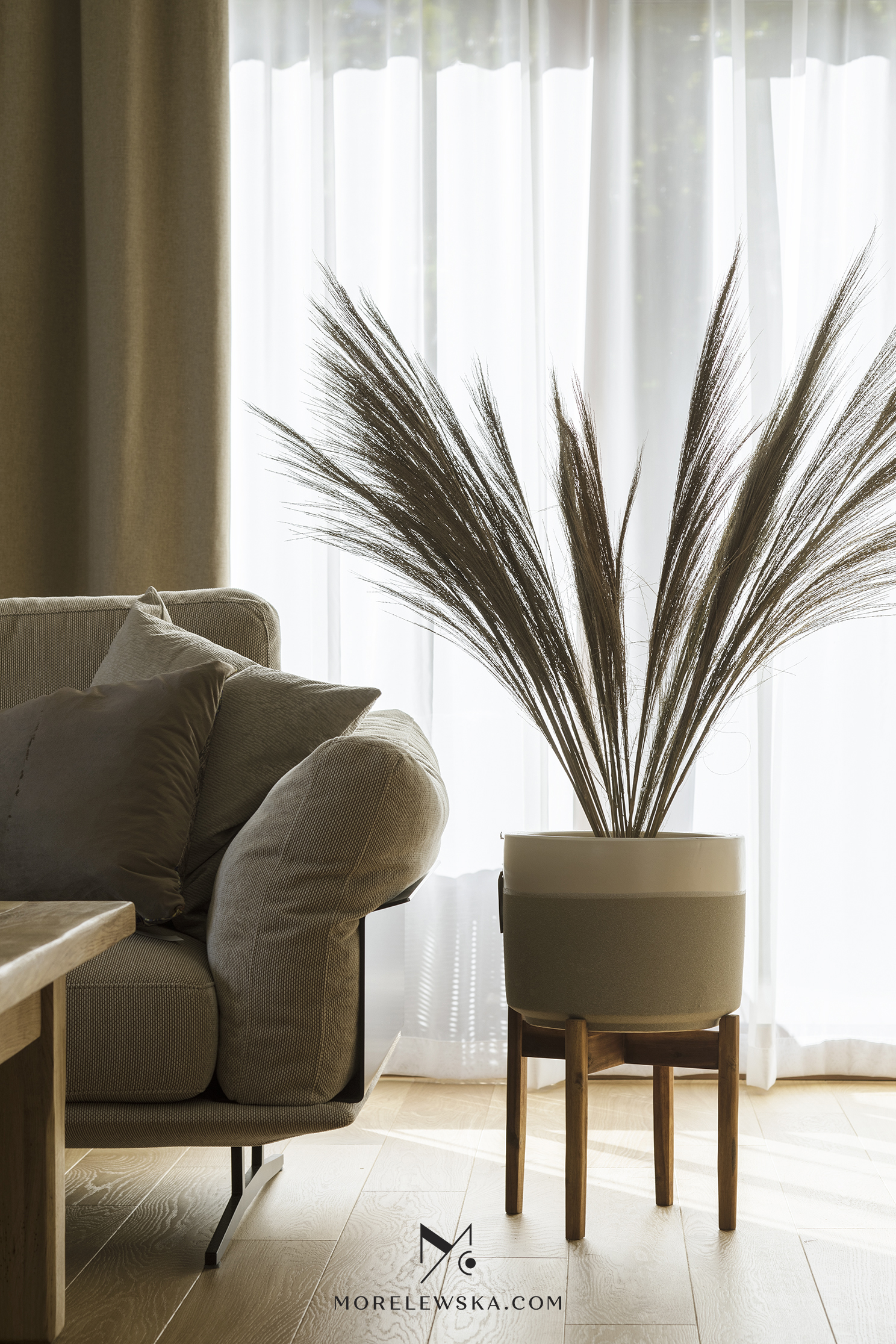 Dom stworzony specjalnie dla miłośników morskich głębin, chociaż wyraźnie zaakcentowane motywy marynistyczne nie dominują przestrzeni. Są jak drugoplanowi bohaterowie – bez nich wnętrze nie byłoby tak wymowne, ale zachowałoby swój pierwotny, kameralny klimat. Jasna, stonowana kolorystyka ocieplona naturalnym drewnem sprawia, że dom pomimo tego, że jest bardzo przestronny, zachowuje przytulny i pełen ciepła charakter. Lamele, dywany, poduszki, koce, świece i oświetlenie czynią to wnętrze jedynym w swoim rodzaju. Z antresoli, w której mieści się siłownia, domownicy mogą obserwować domowe rytuały tych, którzy relaksują się w strefie dziennej albo akurat przyrządzają posiłek.