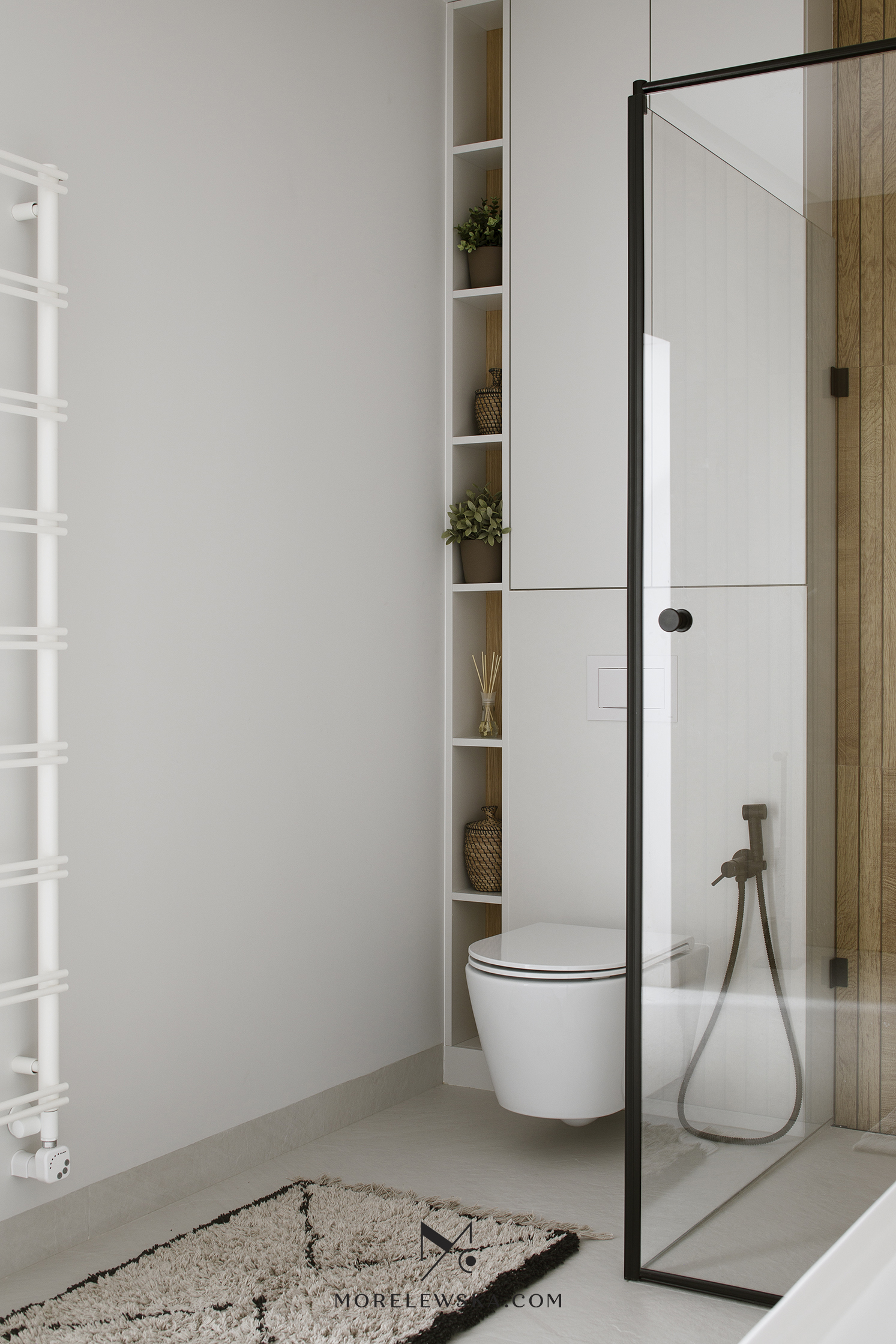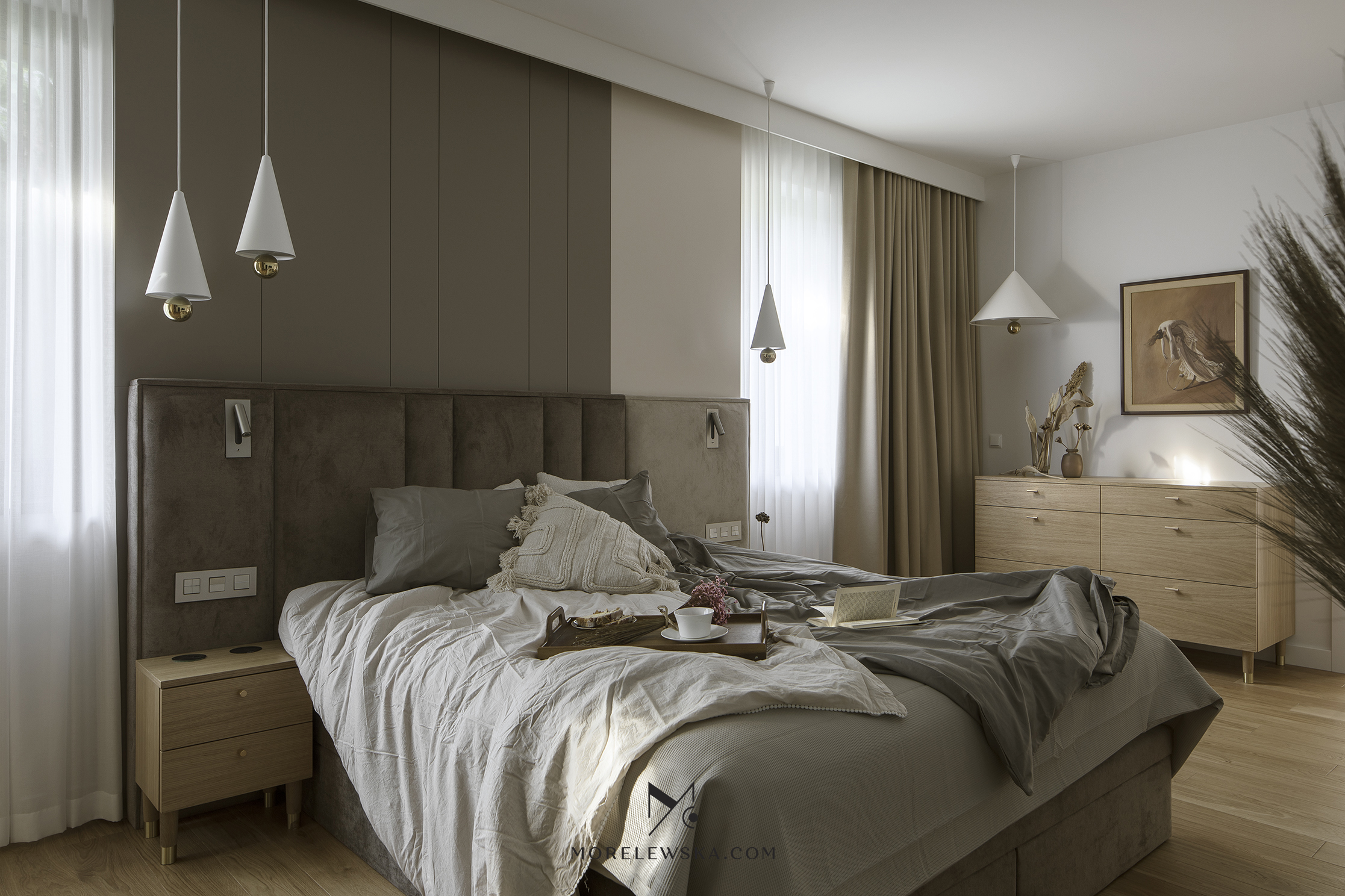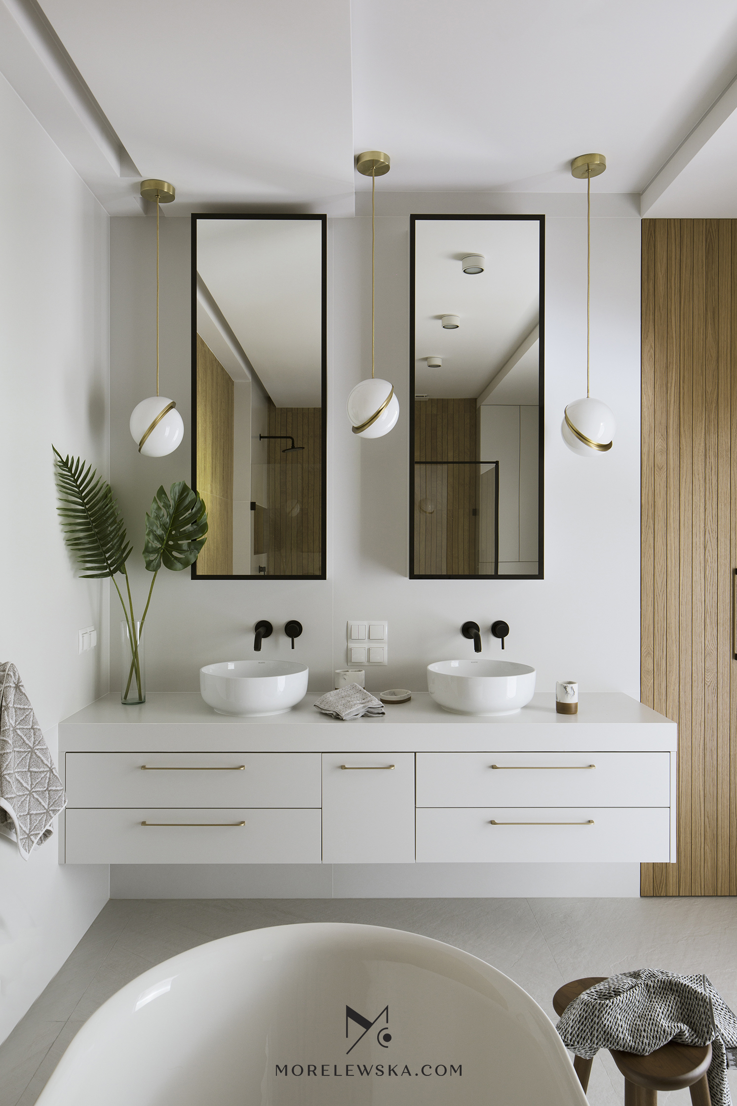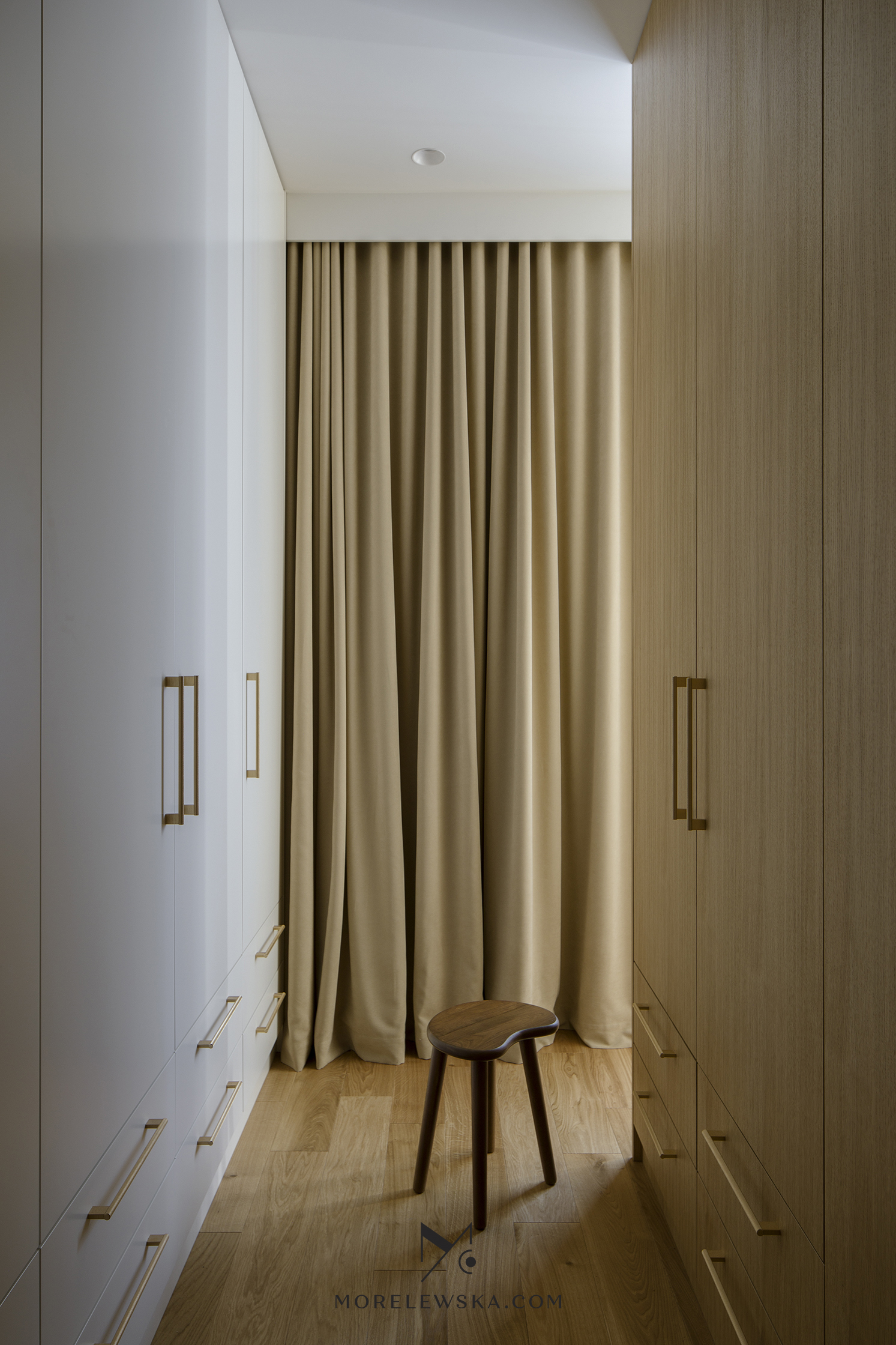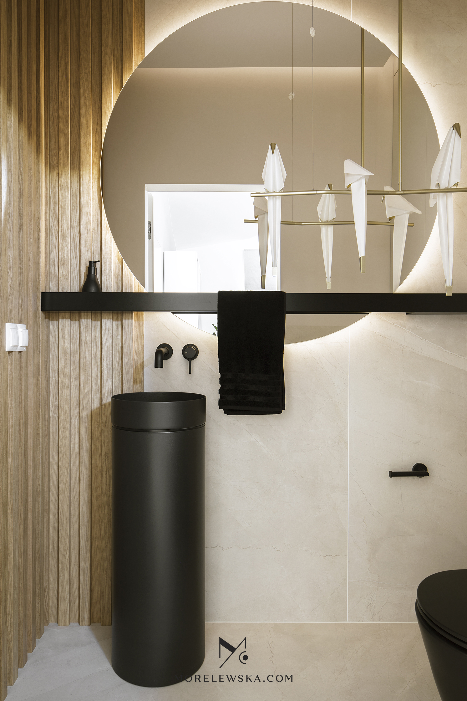 Dom stworzony specjalnie dla miłośników morskich głębin, chociaż wyraźnie zaakcentowane motywy marynistyczne nie dominują przestrzeni. Są jak drugoplanowi bohaterowie – bez nich wnętrze nie byłoby tak wymowne, ale zachowałoby swój pierwotny, kameralny klimat. Jasna, stonowana kolorystyka ocieplona naturalnym drewnem sprawia, że dom pomimo tego, że jest bardzo przestronny, zachowuje przytulny i pełen ciepła charakter. Lamele, dywany, poduszki, koce, świece i oświetlenie czynią to wnętrze jedynym w swoim rodzaju. Z antresoli, w której mieści się siłownia, domownicy mogą obserwować domowe rytuały tych, którzy relaksują się w strefie dziennej albo akurat przyrządzają posiłek.