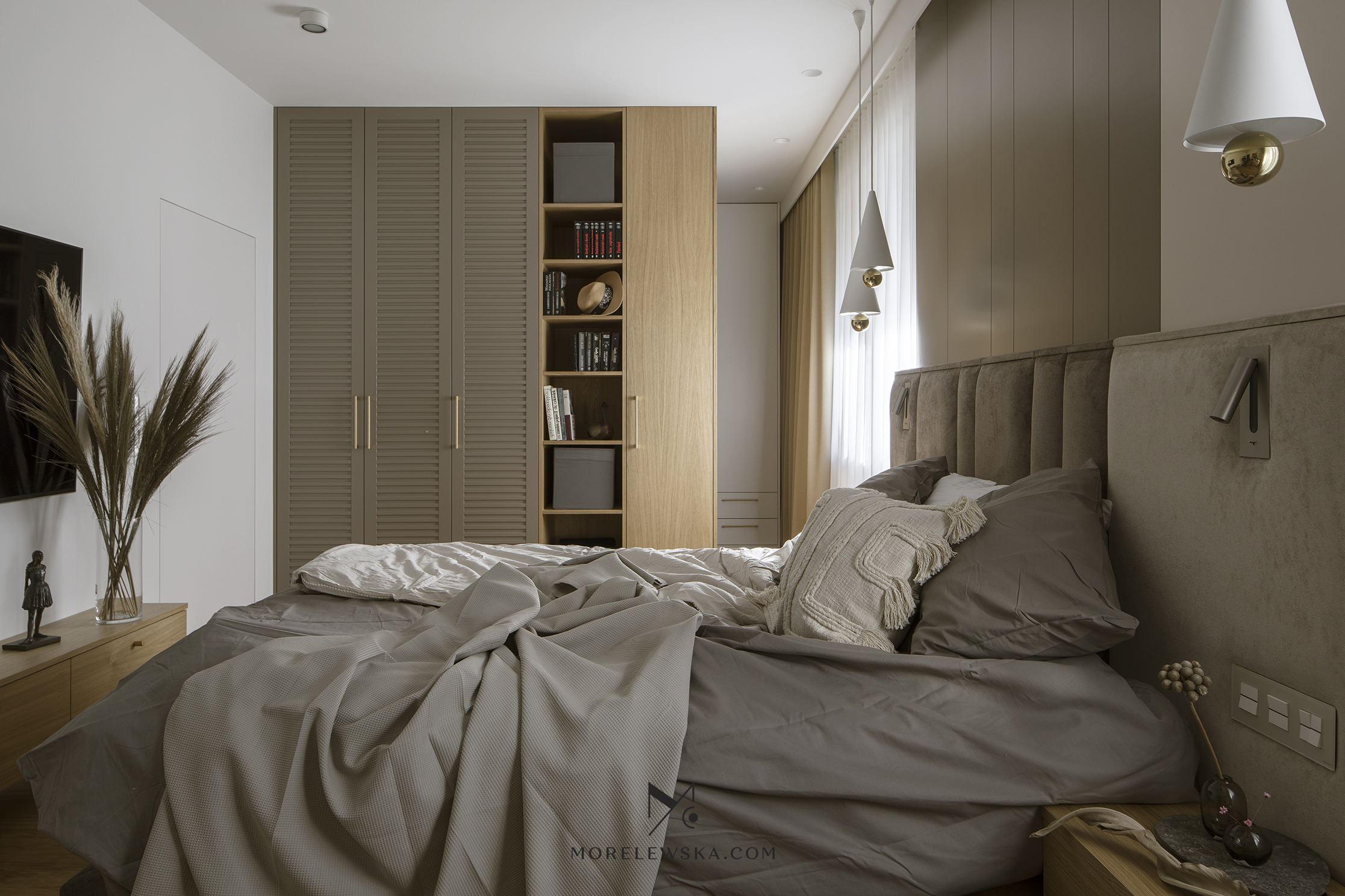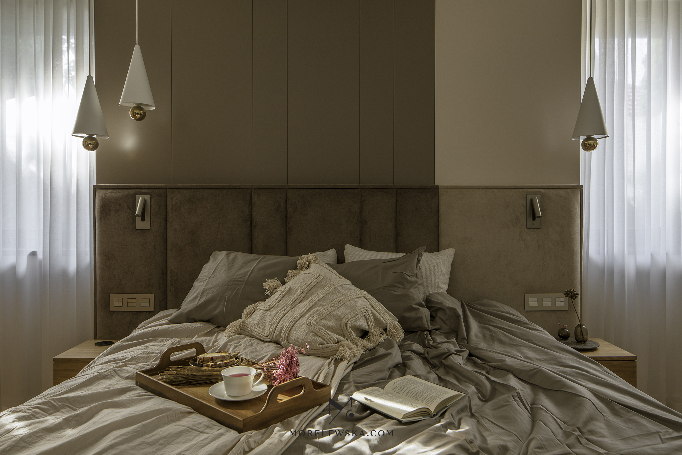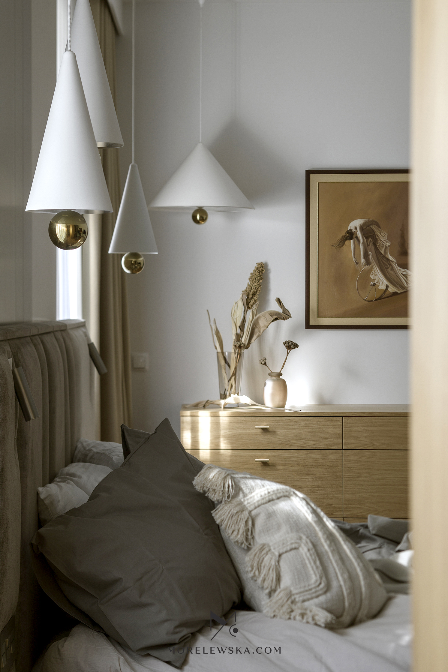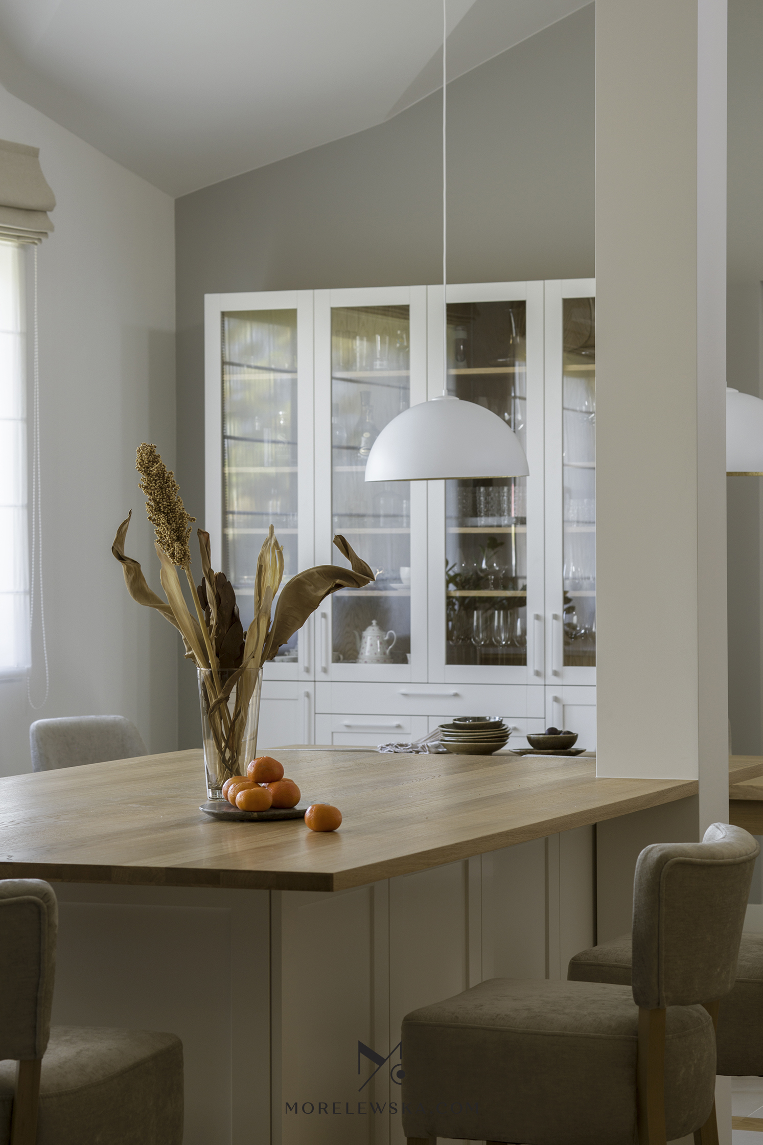 Dom stworzony specjalnie dla miłośników morskich głębin, chociaż wyraźnie zaakcentowane motywy marynistyczne nie dominują przestrzeni. Są jak drugoplanowi bohaterowie – bez nich wnętrze nie byłoby tak wymowne, ale zachowałoby swój pierwotny, kameralny klimat. Jasna, stonowana kolorystyka ocieplona naturalnym drewnem sprawia, że dom pomimo tego, że jest bardzo przestronny, zachowuje przytulny i pełen ciepła charakter. Lamele, dywany, poduszki, koce, świece i oświetlenie czynią to wnętrze jedynym w swoim rodzaju. Z antresoli, w której mieści się siłownia, domownicy mogą obserwować domowe rytuały tych, którzy relaksują się w strefie dziennej albo akurat przyrządzają posiłek.
