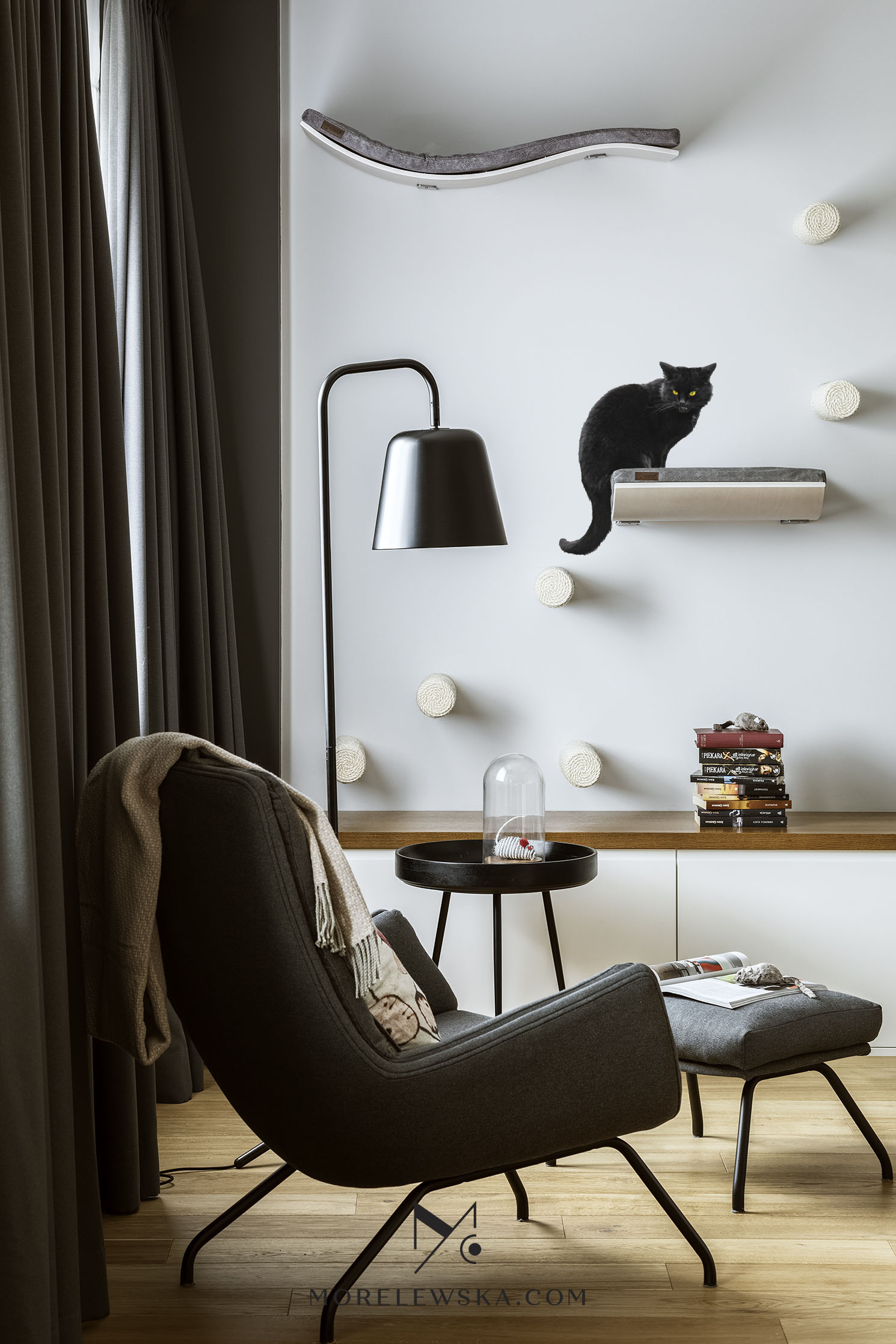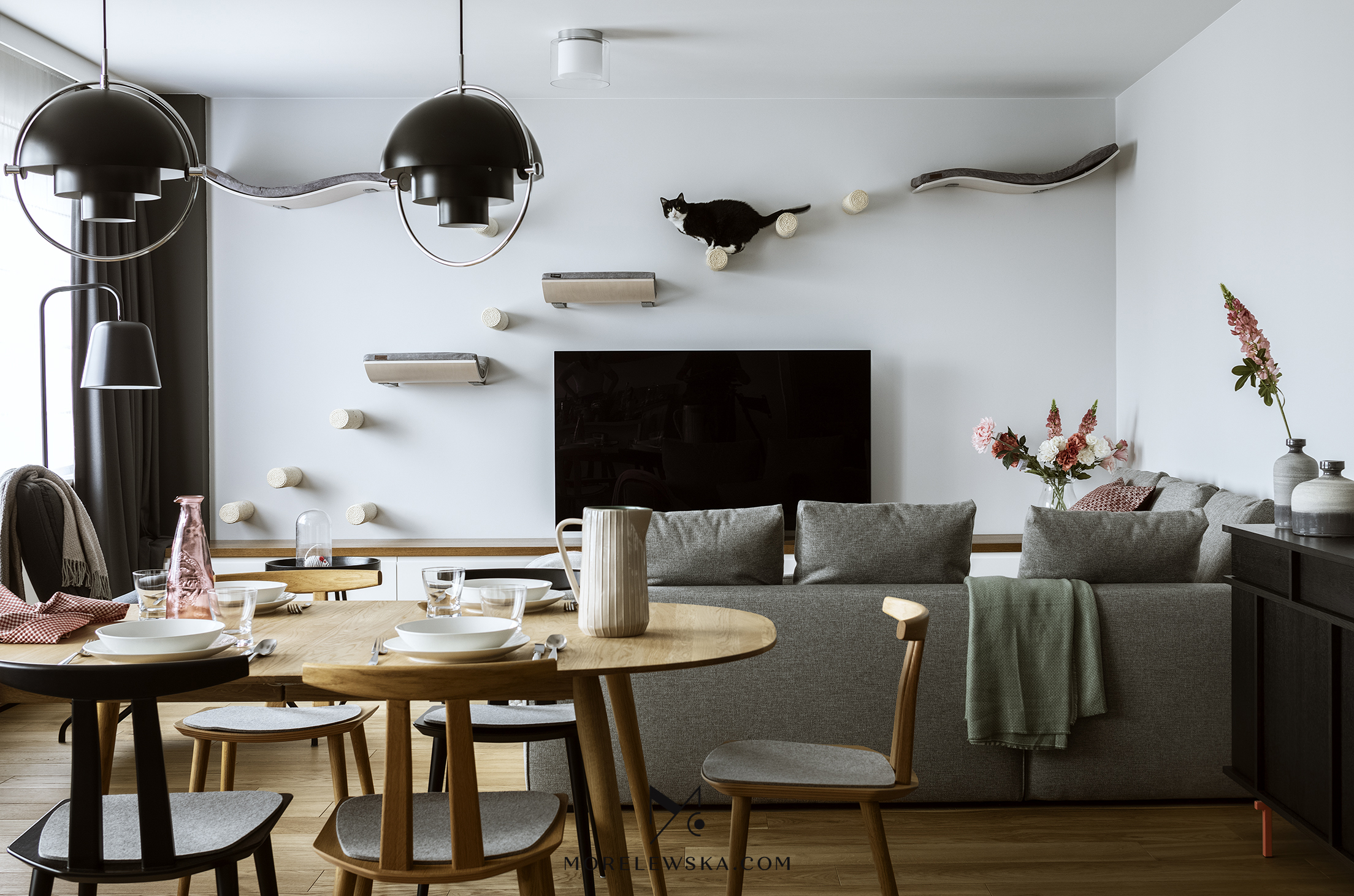 i nowoczesne, ale nie traci na przytulności. Domowa strefa spa w postaci sauny w łazience czy ściana zaprojektowana specjalnie dla kotów czynią to miejsce prawdziwym domem, w którym spełniają się marzenia absolutnie wszystkich domowników.