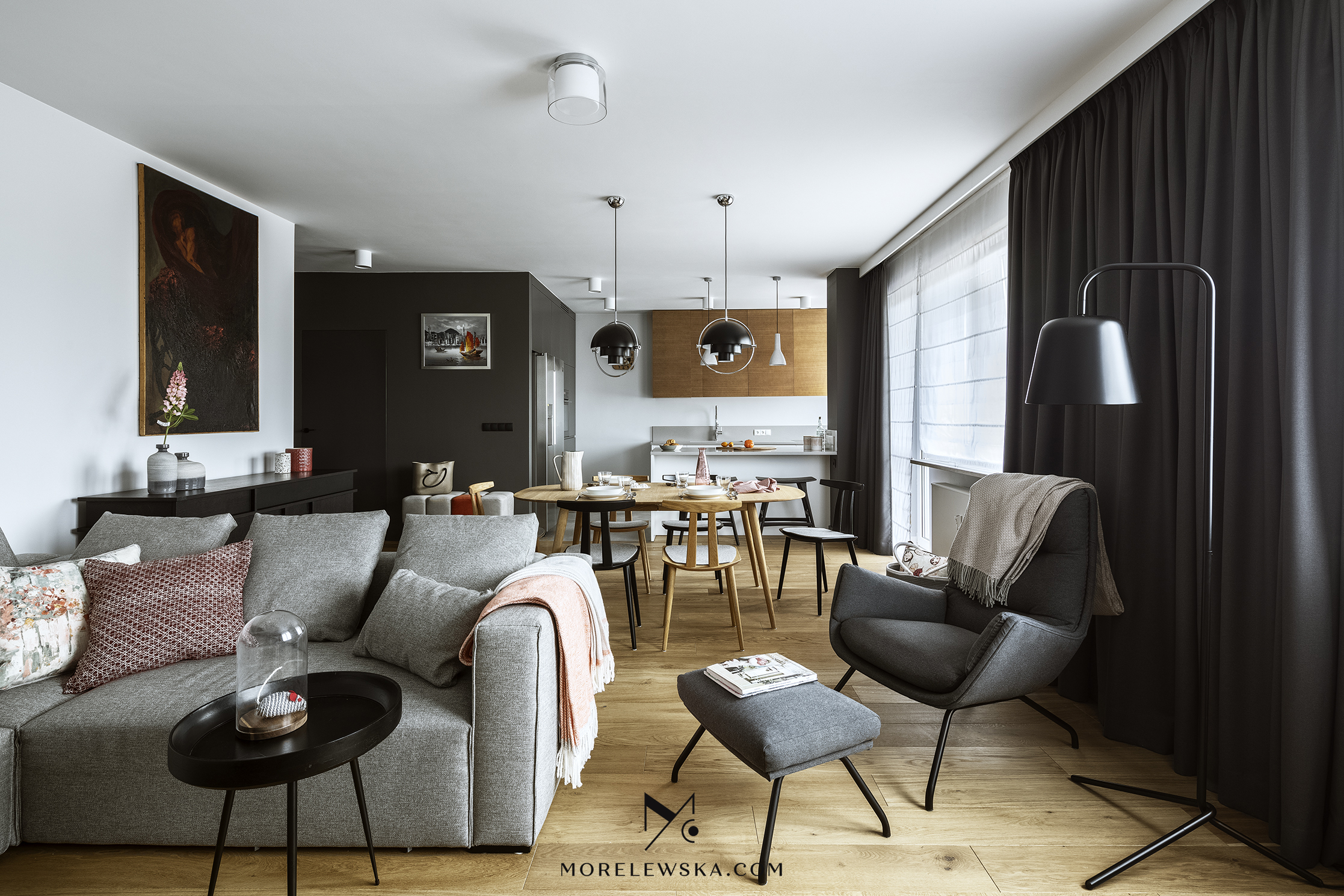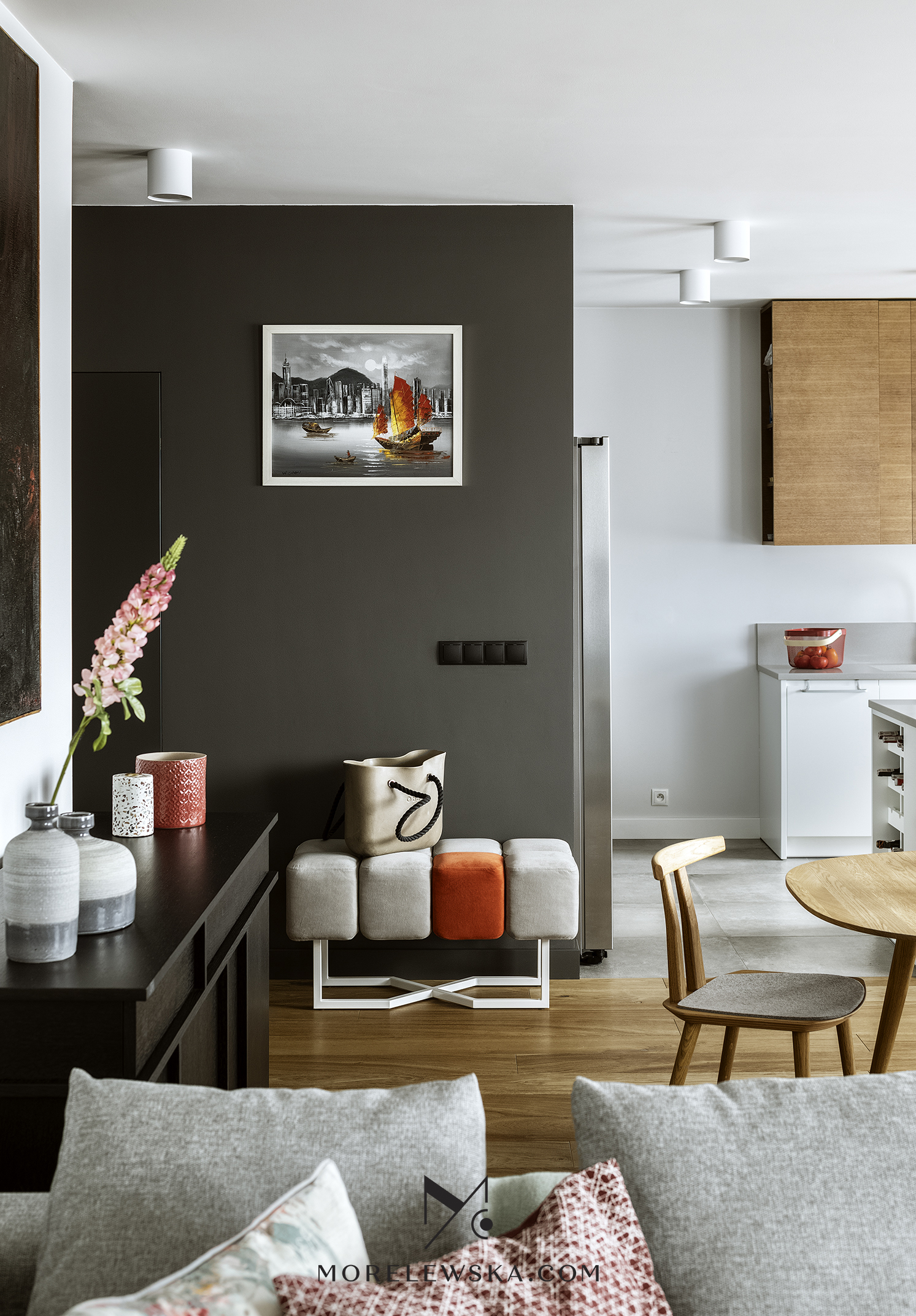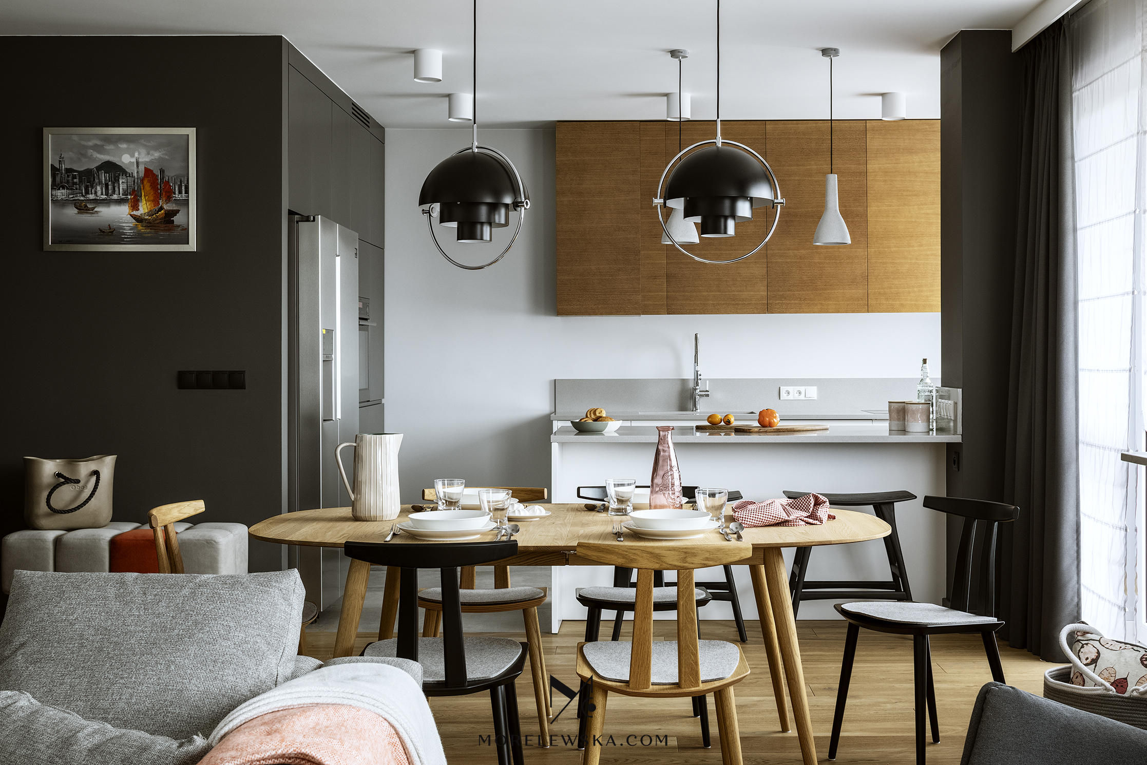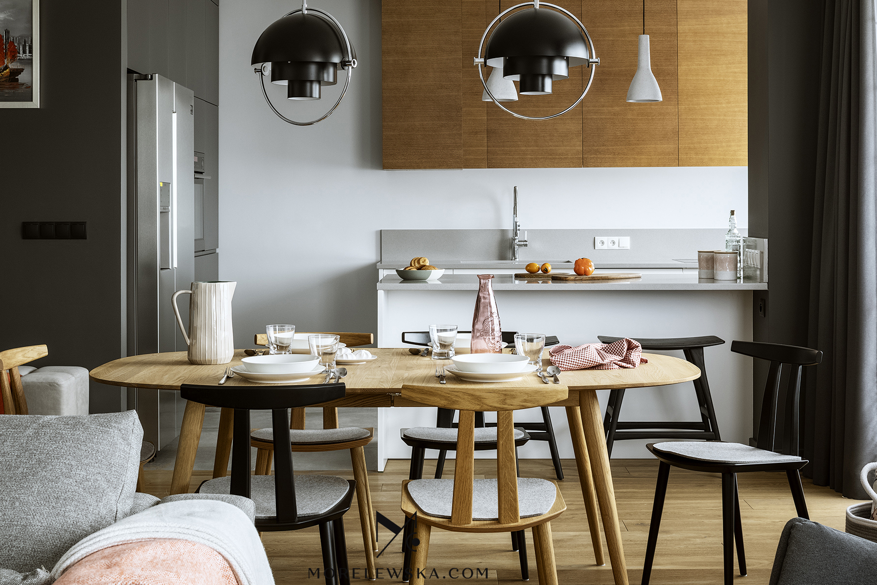 Metamorfoza wnętrza może być potrzebna również wtedy, gdy dorosłe dzieci opuszczają rodzinny dom. Zmiana układu funkcji w mieszkaniu zaowocowała przestronną strefą dzienną w postaci kuchni otwartej na salon. To tutaj „bije serce” tego mieszkania. Kolorystyka wnętrza, utrzymana w delikatnych bielach, subtelnych szarościach i wyrazistym antracycie, została ocieplona naturalnym drewnem, dzięki czemu mieszkanie jest eleganckie
