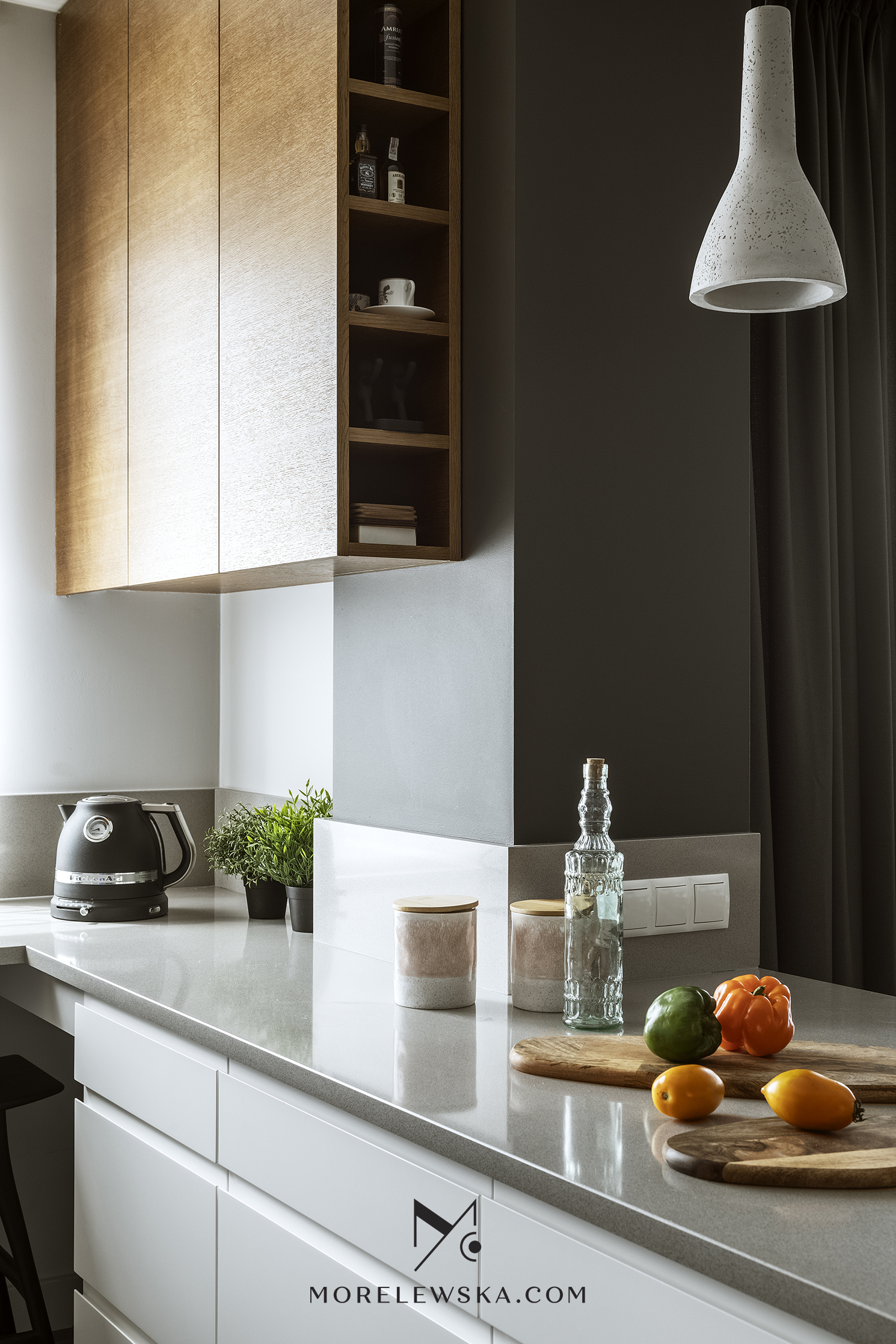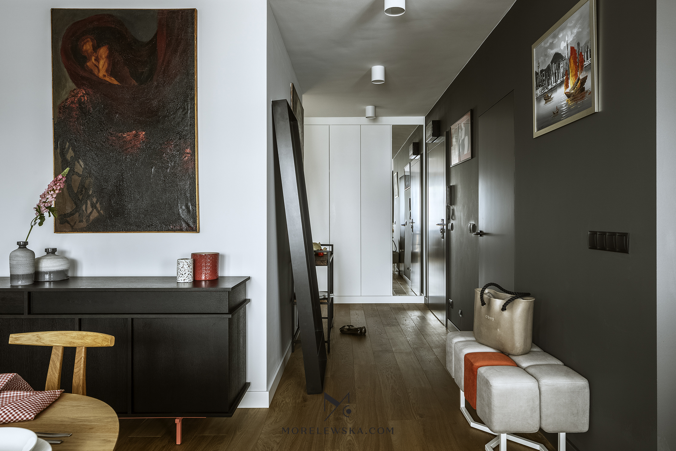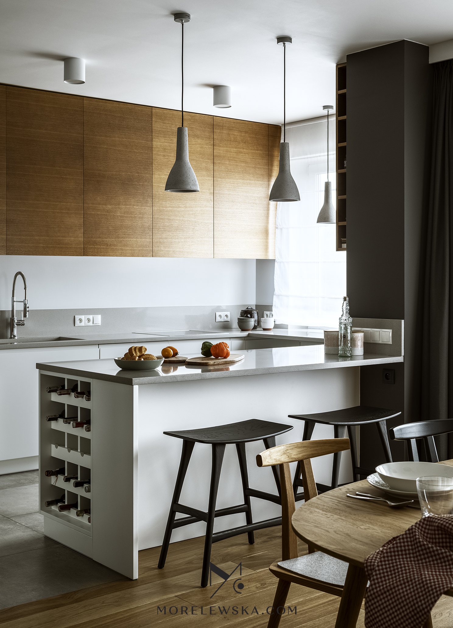 Metamorfoza wnętrza może być potrzebna również wtedy, gdy dorosłe dzieci opuszczają rodzinny dom. Zmiana układu funkcji w mieszkaniu zaowocowała przestronną strefą dzienną w postaci kuchni otwartej na salon. To tutaj „bije serce” tego mieszkania. Kolorystyka wnętrza, utrzymana w delikatnych bielach, subtelnych szarościach i wyrazistym antracycie, została ocieplona naturalnym drewnem, dzięki czemu mieszkanie jest eleganckie