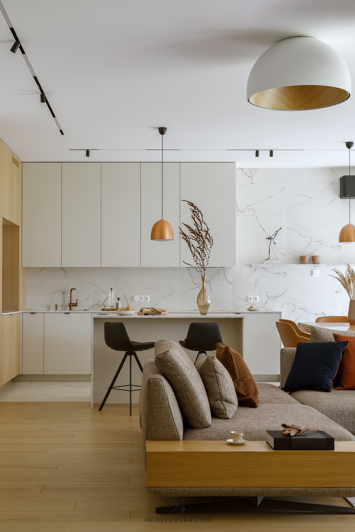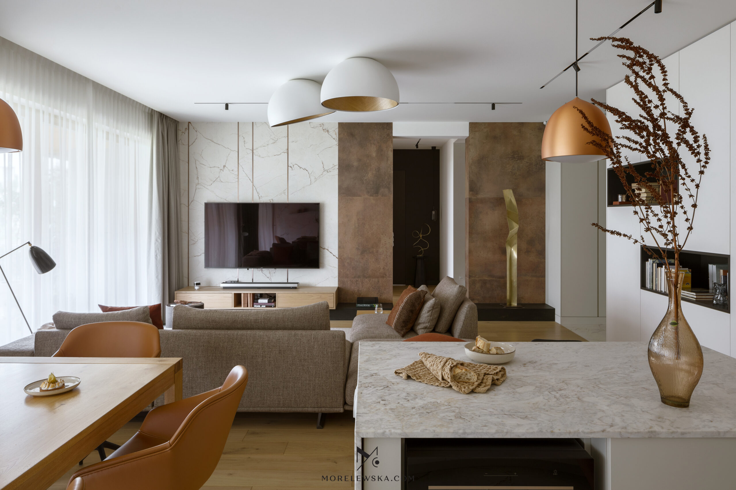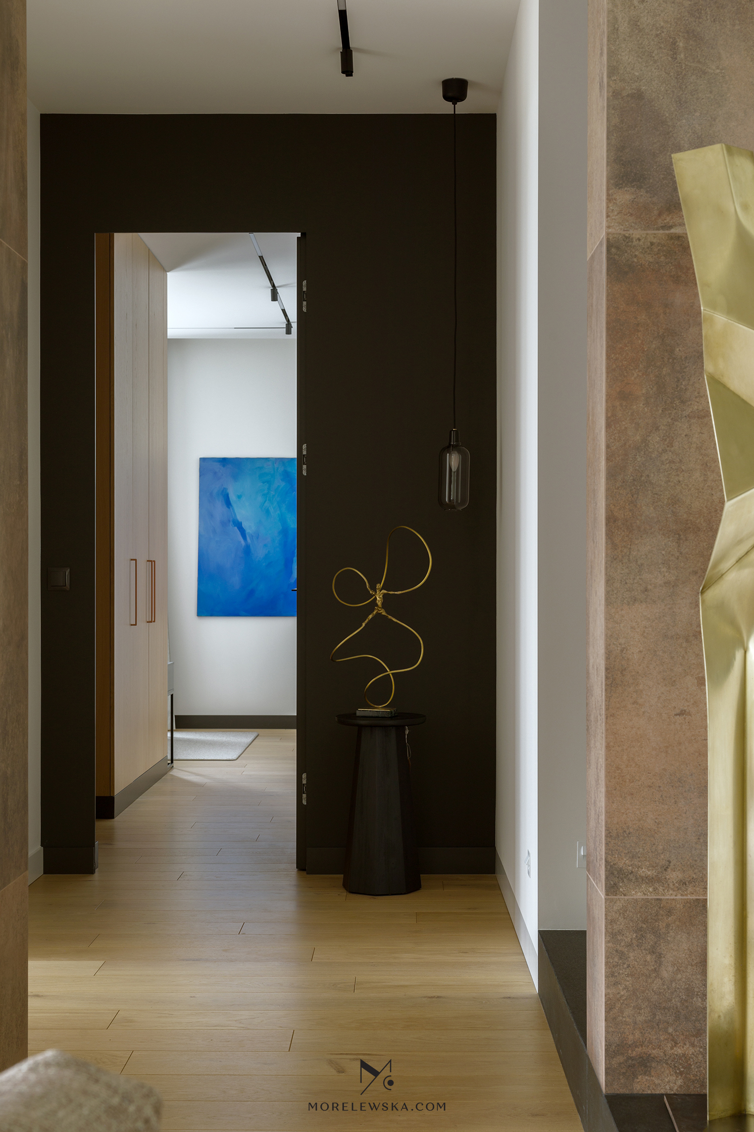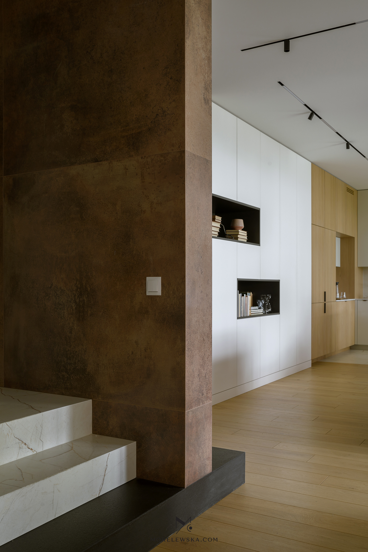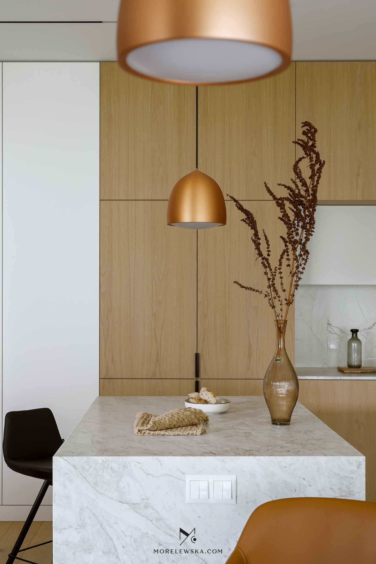 Mieszkanie na Mokotowie to przestrzeń zaprojektowana dla pary, która dużo pracuje zdalnie. Utrzymane w barwach natury z miedzianymi akcentami i kobaltowymi detalami w sypialni, łączy elegancję z funkcjonalnością. Część mieszkania, podniesiona o trzy schodki przez dewelopera, została wykorzystana do wydzielenia głównej łazienki i sporej pralni. Przejście między częścią dzienną a prywatną zaakcentowano płytami imitującymi metal, a niska półka przy podłodze stanowi element ekspozycji dla rzeźby Krzysztofa Renesa. Mieszkanie jest bogate w specjalne rozwiązania do przechowywania, takie jak przestrzeń na torby do golfa czy półki na albumy z wielu podróży inwestorów. Przestronna kuchnia z wyspą i obrotowe krzesła oraz hokery zapewniają wygodę użytkowania i sprzyjają wspólnemu spędzaniu czasu.