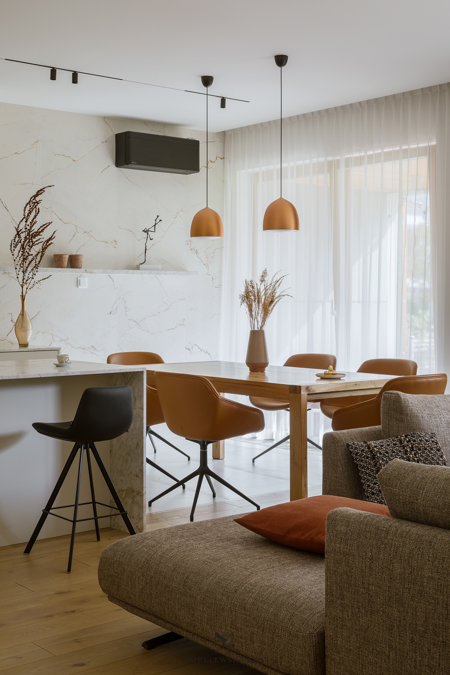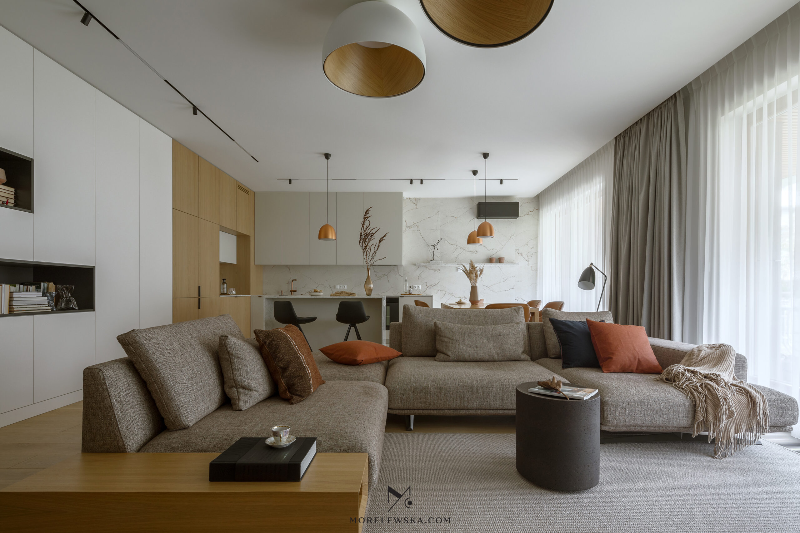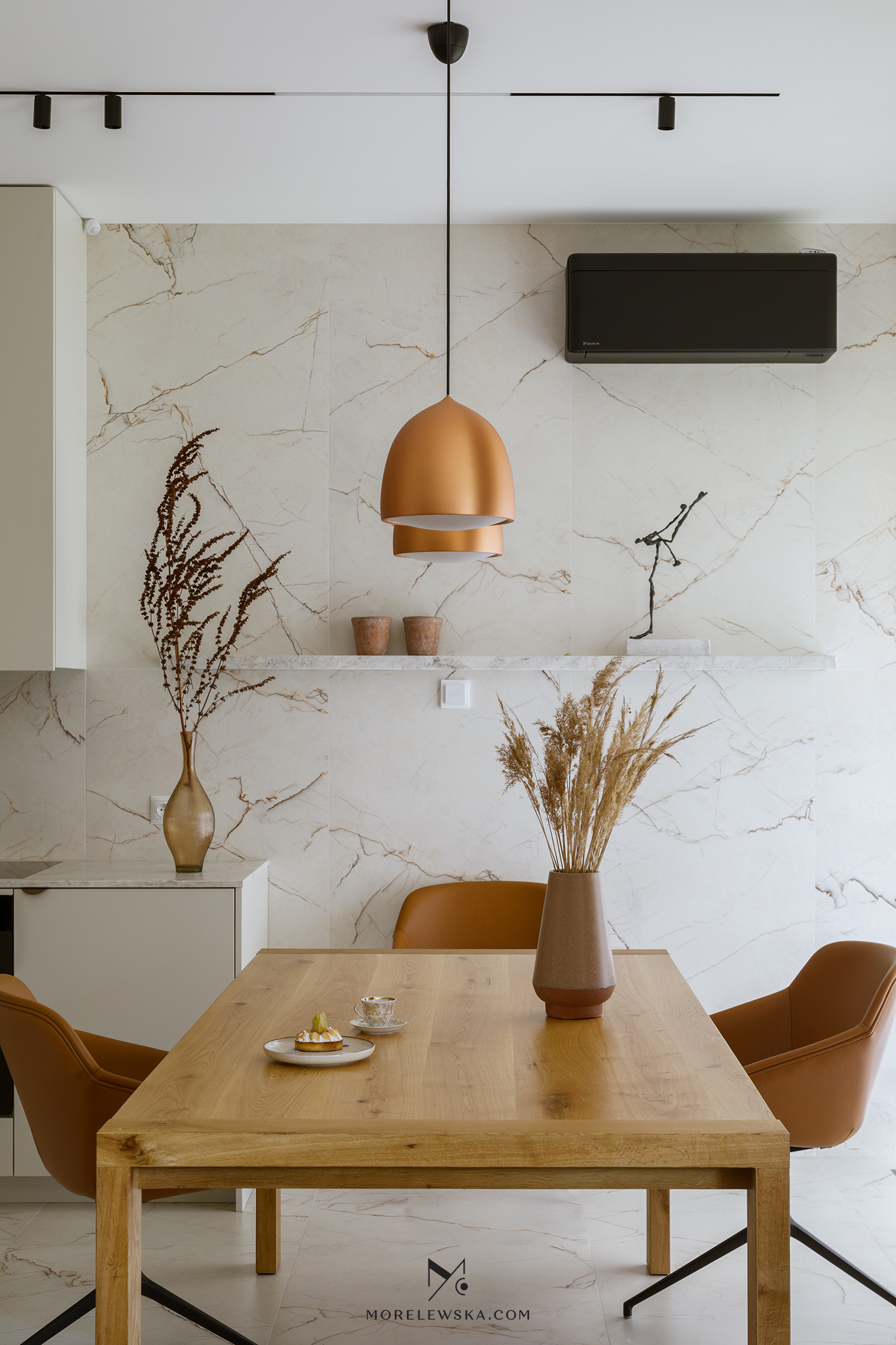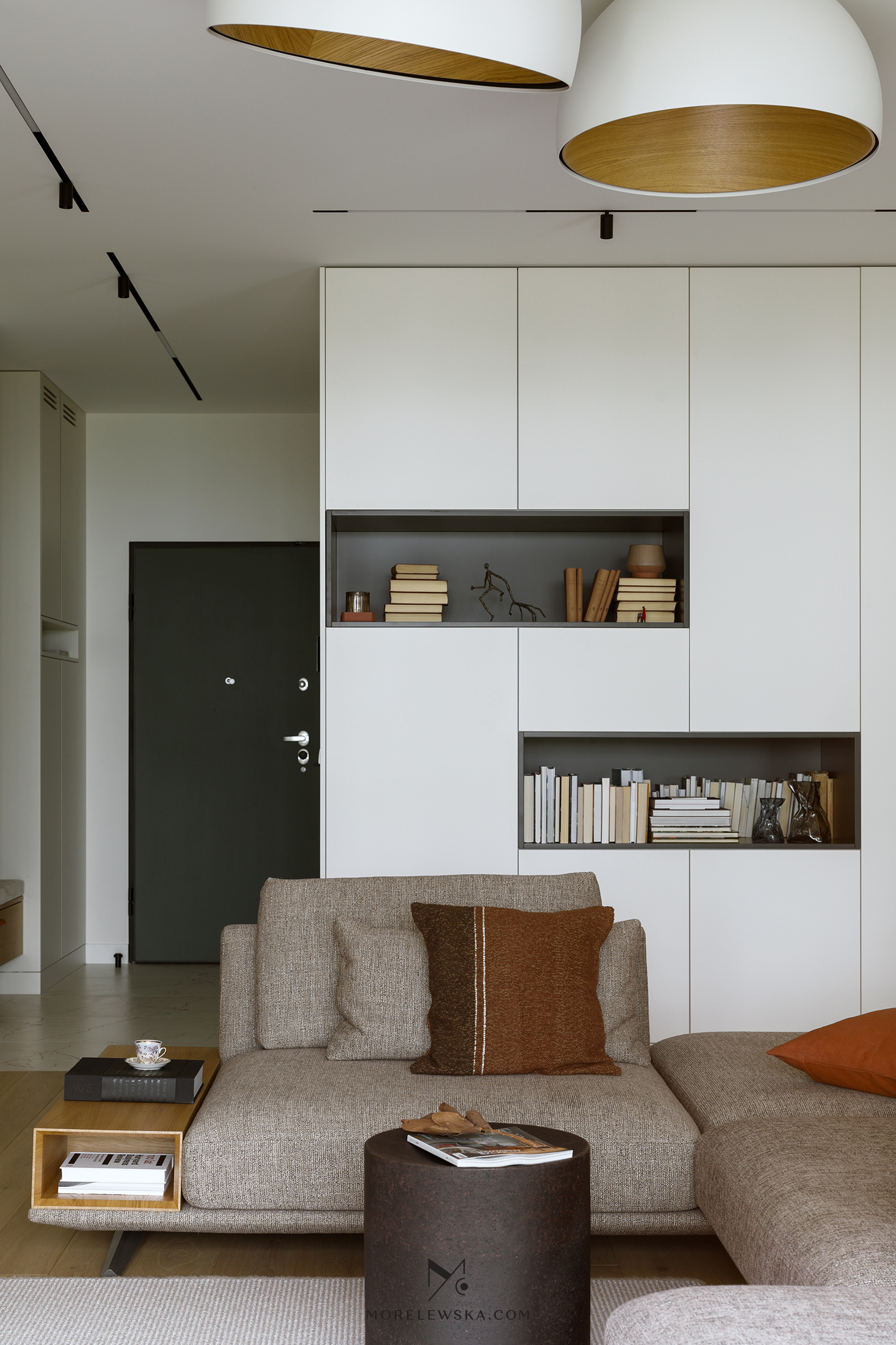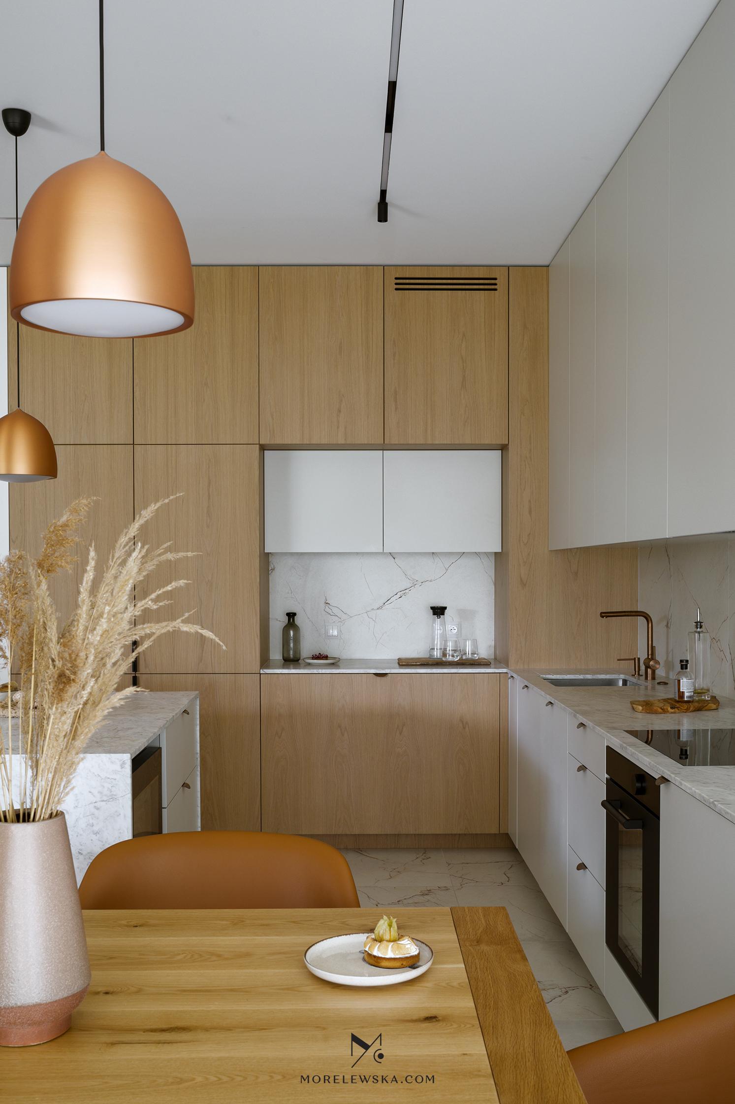 Mieszkanie na Mokotowie to przestrzeń zaprojektowana dla pary, która dużo pracuje zdalnie. Utrzymane w barwach natury z miedzianymi akcentami i kobaltowymi detalami w sypialni, łączy elegancję z funkcjonalnością. Część mieszkania, podniesiona o trzy schodki przez dewelopera, została wykorzystana do wydzielenia głównej łazienki i sporej pralni. Przejście między częścią dzienną a prywatną zaakcentowano płytami imitującymi metal, a niska półka przy podłodze stanowi element ekspozycji dla rzeźby Krzysztofa Renesa. Mieszkanie jest bogate w specjalne rozwiązania do przechowywania, takie jak przestrzeń na torby do golfa czy półki na albumy z wielu podróży inwestorów. Przestronna kuchnia z wyspą i obrotowe krzesła oraz hokery zapewniają wygodę użytkowania i sprzyjają wspólnemu spędzaniu czasu.