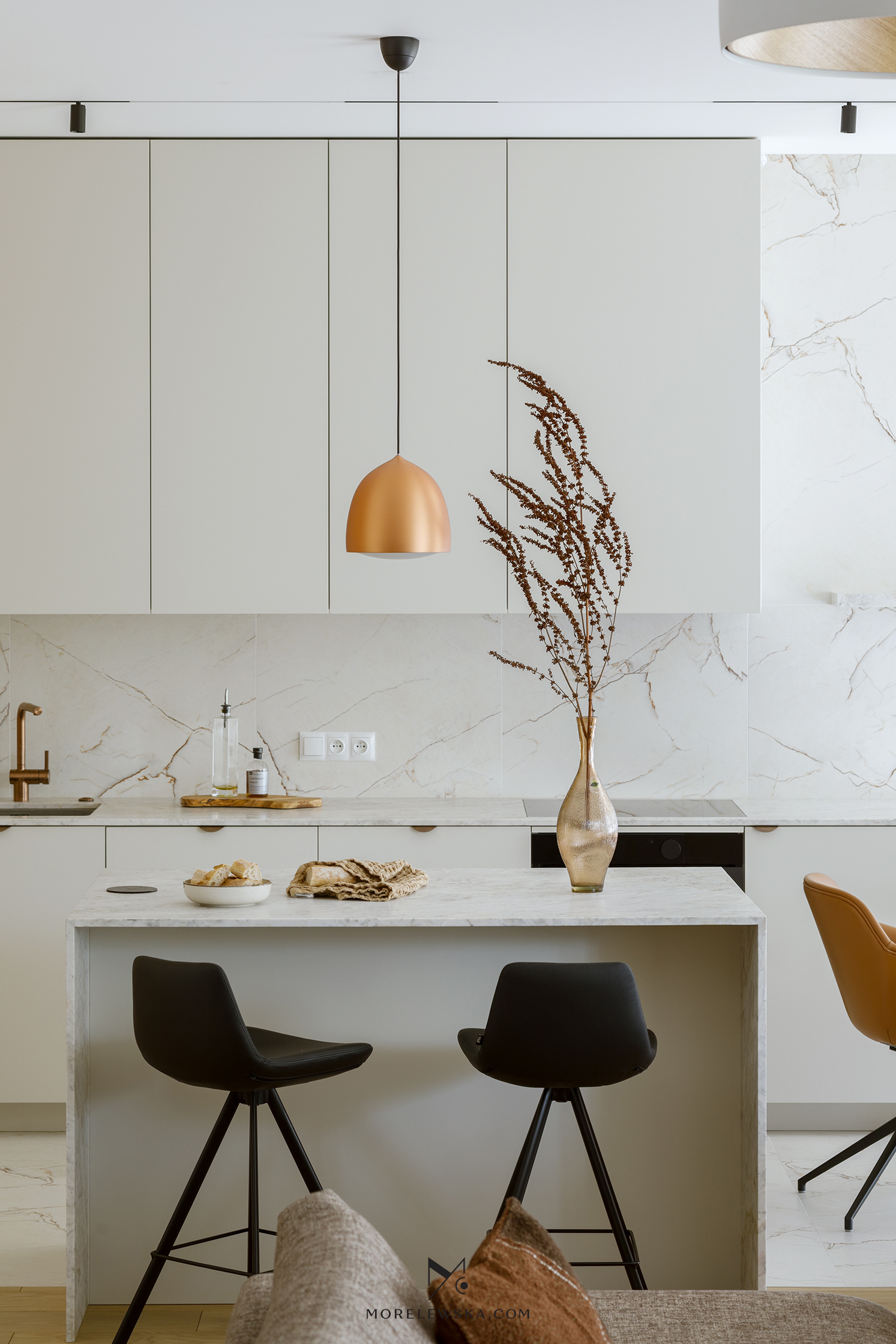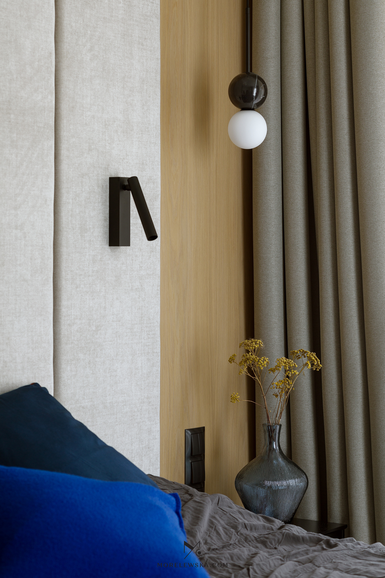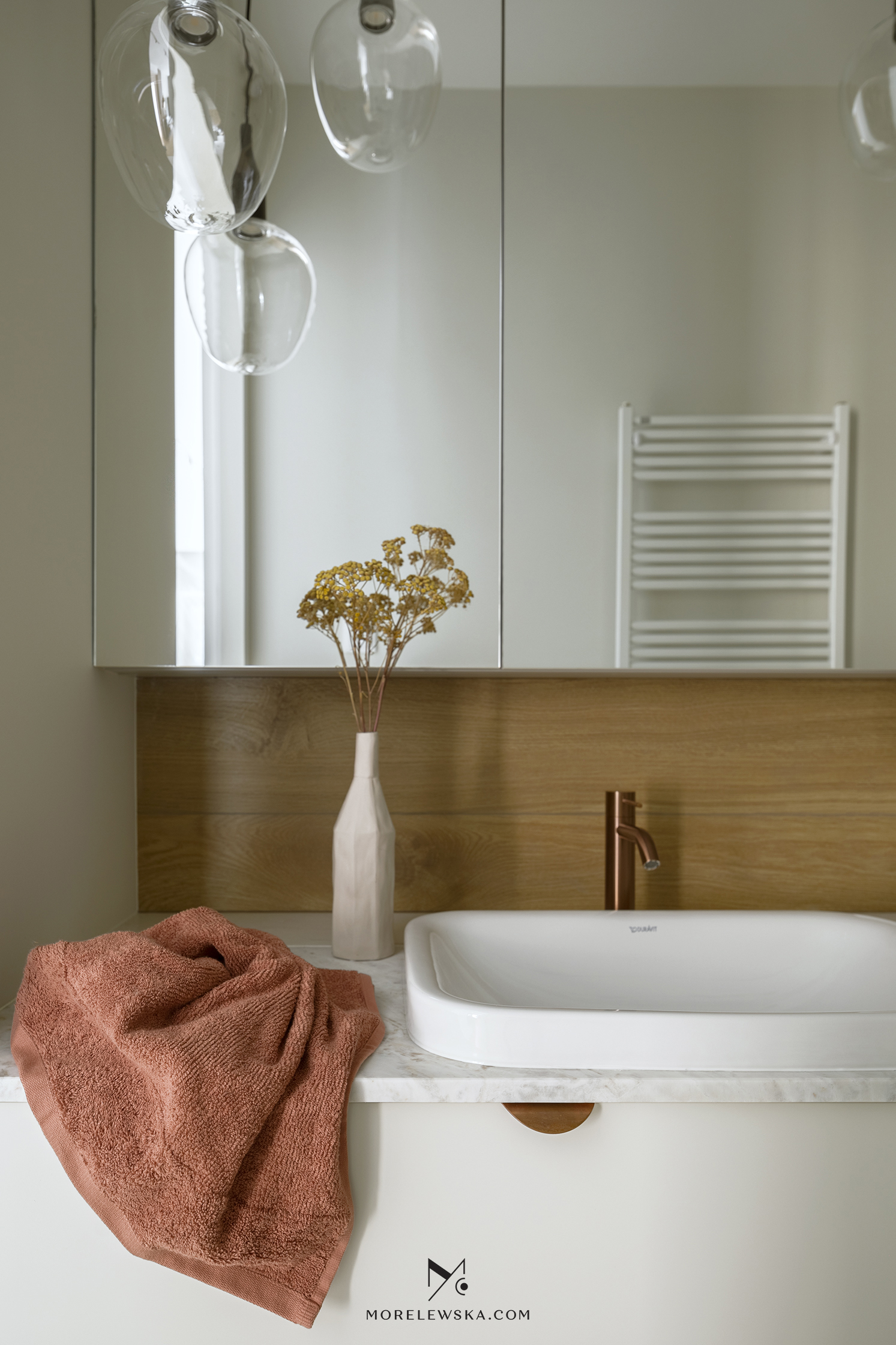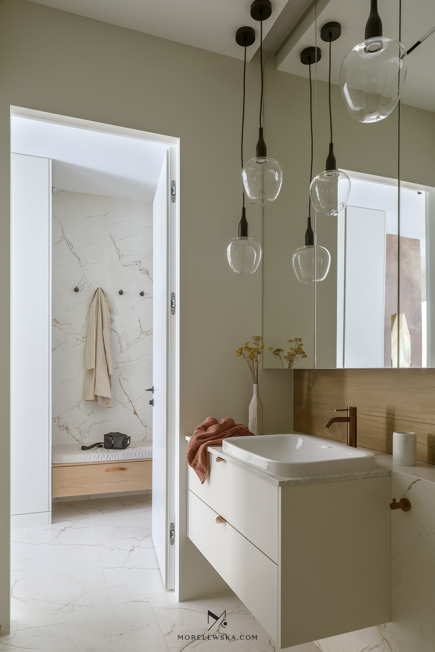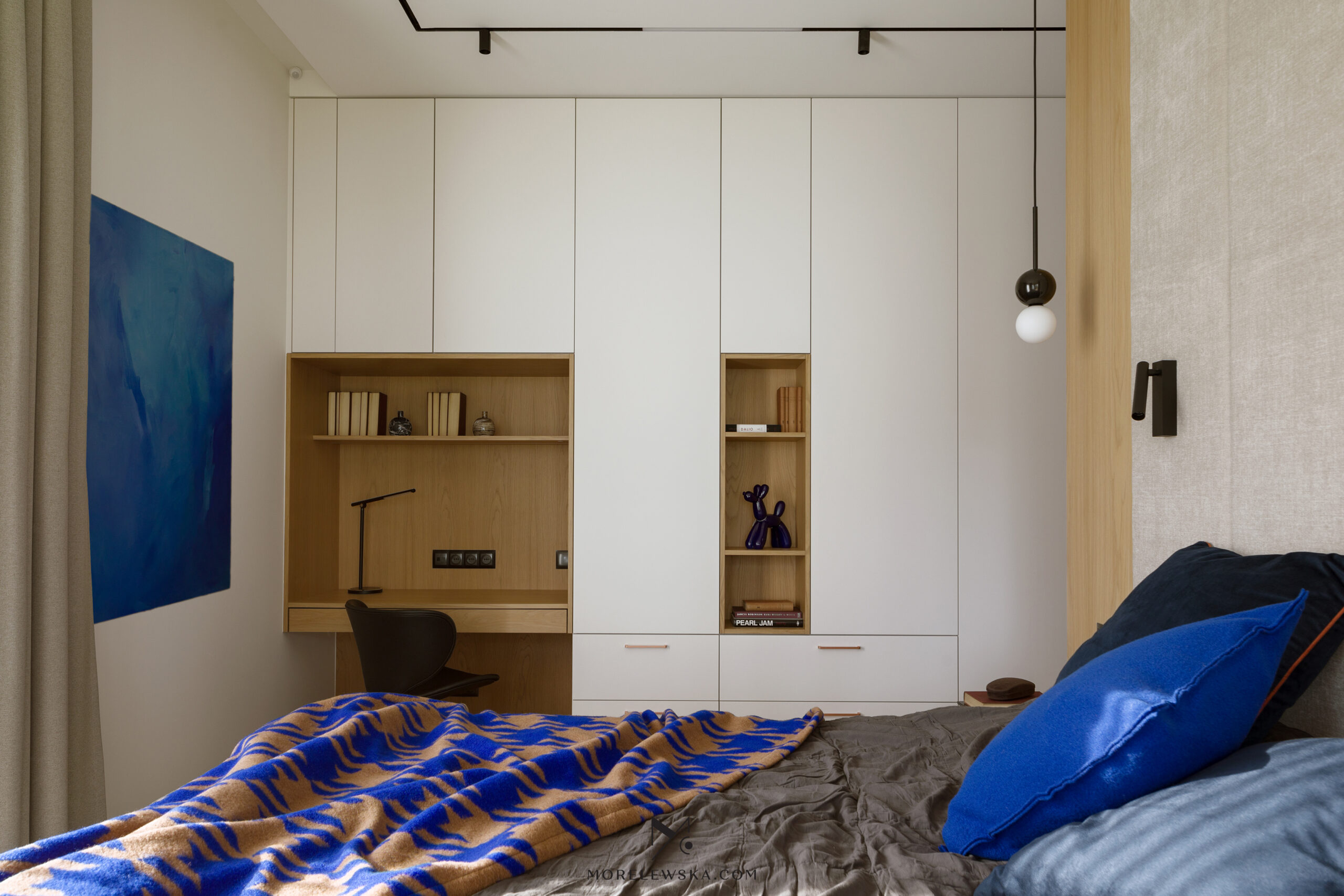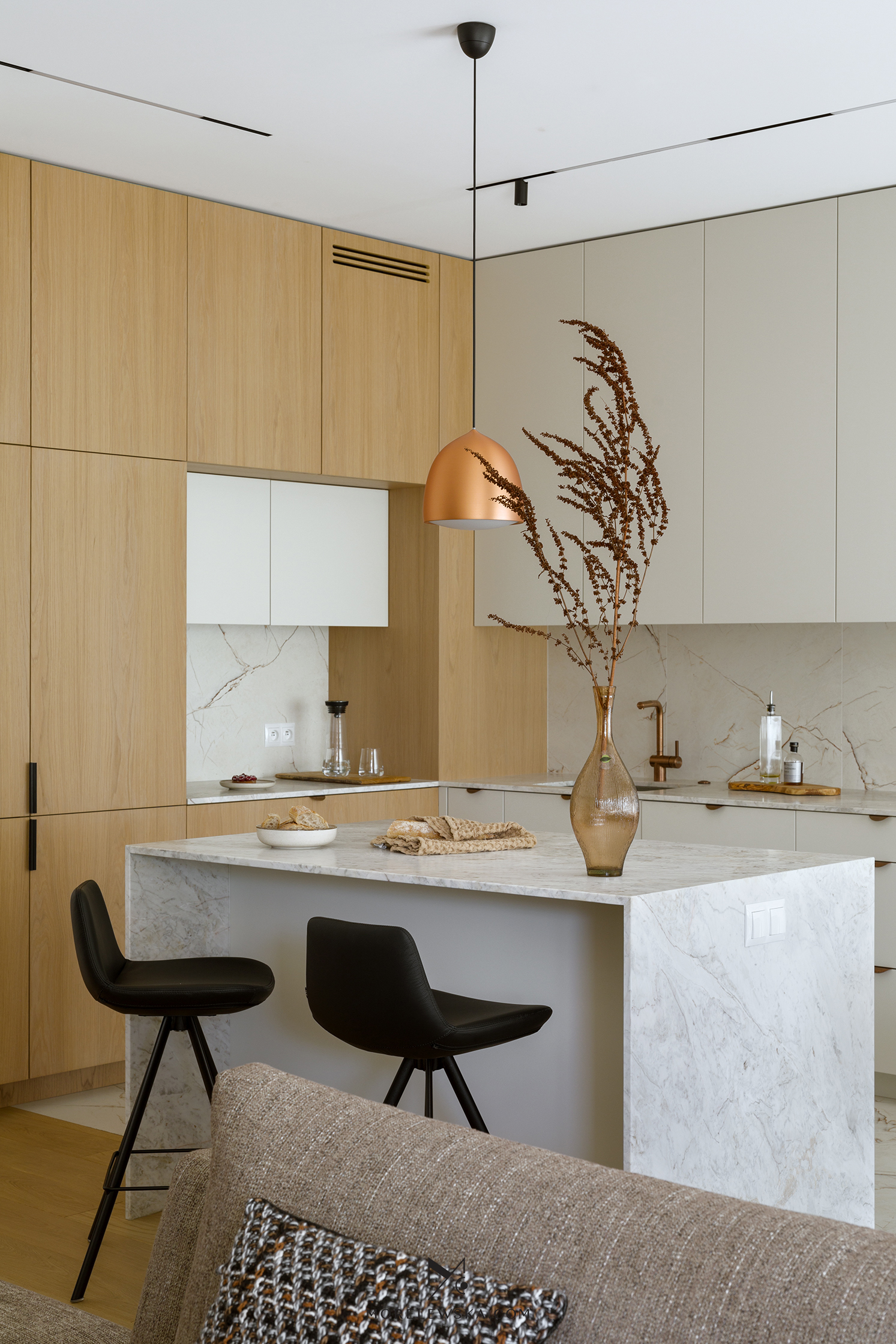 Mieszkanie na Mokotowie to przestrzeń zaprojektowana dla pary, która dużo pracuje zdalnie. Utrzymane w barwach natury z miedzianymi akcentami i kobaltowymi detalami w sypialni, łączy elegancję z funkcjonalnością. Część mieszkania, podniesiona o trzy schodki przez dewelopera, została wykorzystana do wydzielenia głównej łazienki i sporej pralni. Przejście między częścią dzienną a prywatną zaakcentowano płytami imitującymi metal, a niska półka przy podłodze stanowi element ekspozycji dla rzeźby Krzysztofa Renesa. Mieszkanie jest bogate w specjalne rozwiązania do przechowywania, takie jak przestrzeń na torby do golfa czy półki na albumy z wielu podróży inwestorów. Przestronna kuchnia z wyspą i obrotowe krzesła oraz hokery zapewniają wygodę użytkowania i sprzyjają wspólnemu spędzaniu czasu.