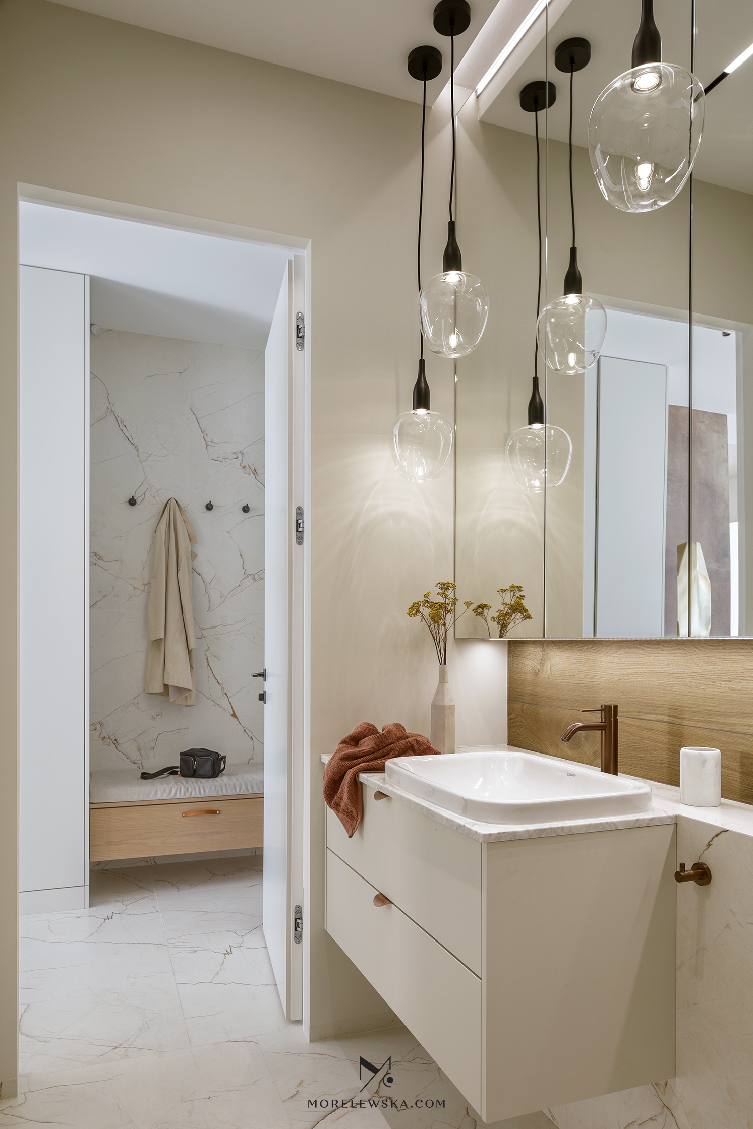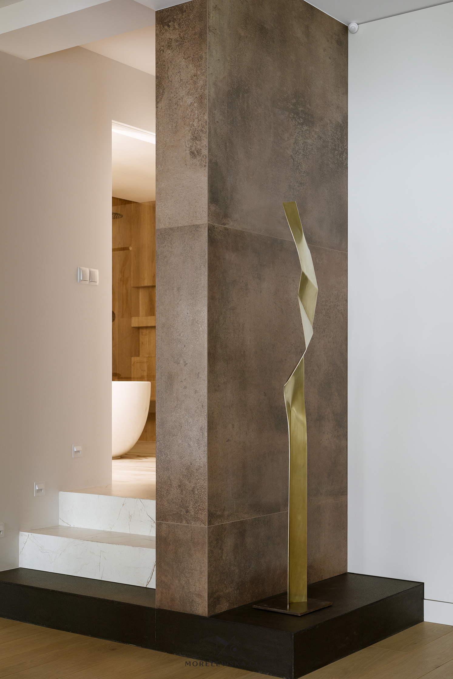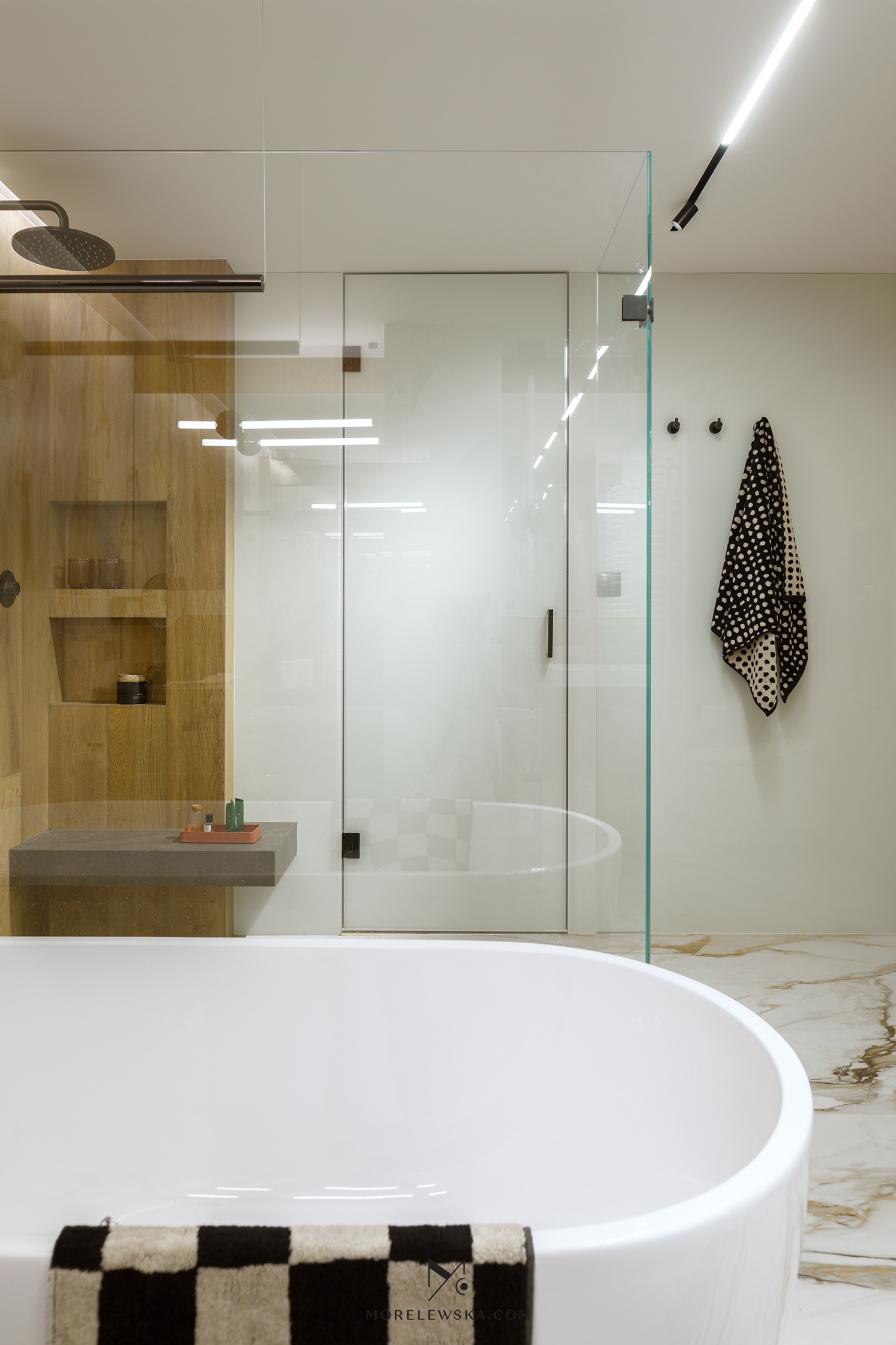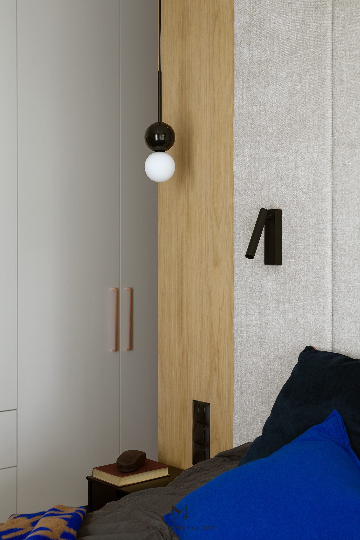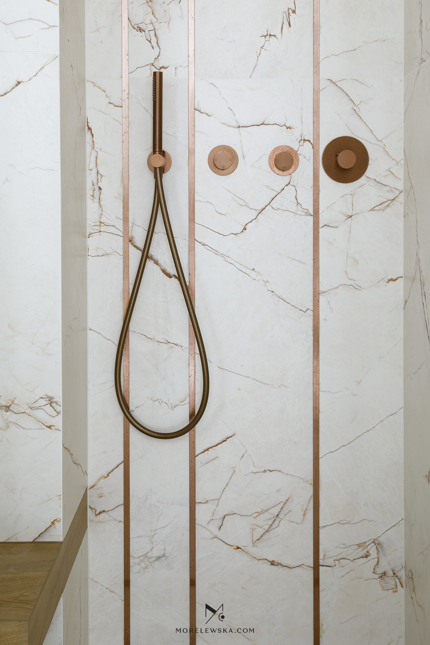 Mieszkanie na Mokotowie to przestrzeń zaprojektowana dla pary, która dużo pracuje zdalnie. Utrzymane w barwach natury z miedzianymi akcentami i kobaltowymi detalami w sypialni, łączy elegancję z funkcjonalnością. Część mieszkania, podniesiona o trzy schodki przez dewelopera, została wykorzystana do wydzielenia głównej łazienki i sporej pralni. Przejście między częścią dzienną a prywatną zaakcentowano płytami imitującymi metal, a niska półka przy podłodze stanowi element ekspozycji dla rzeźby Krzysztofa Renesa. Mieszkanie jest bogate w specjalne rozwiązania do przechowywania, takie jak przestrzeń na torby do golfa czy półki na albumy z wielu podróży inwestorów. Przestronna kuchnia z wyspą i obrotowe krzesła oraz hokery zapewniają wygodę użytkowania i sprzyjają wspólnemu spędzaniu czasu.