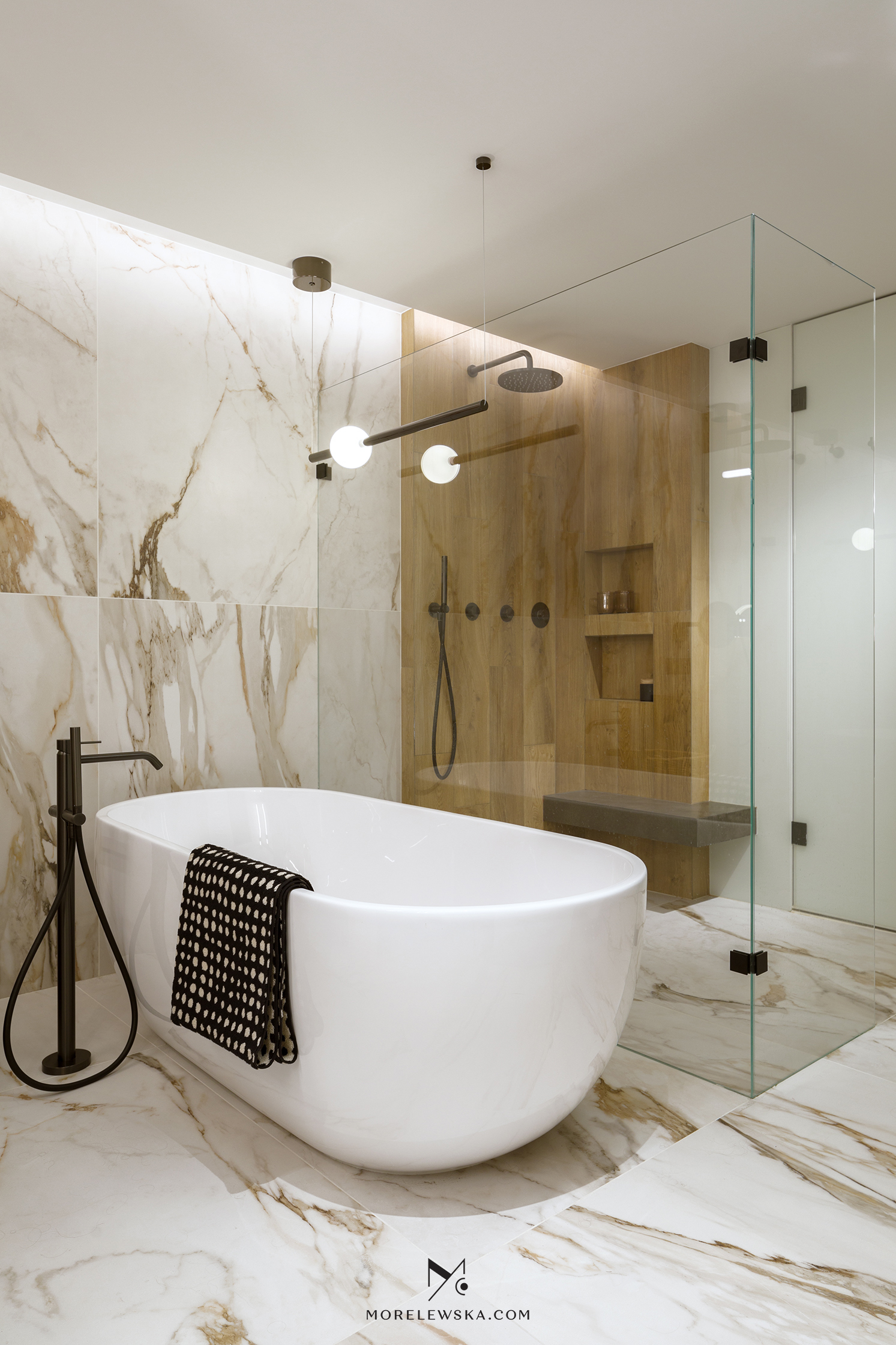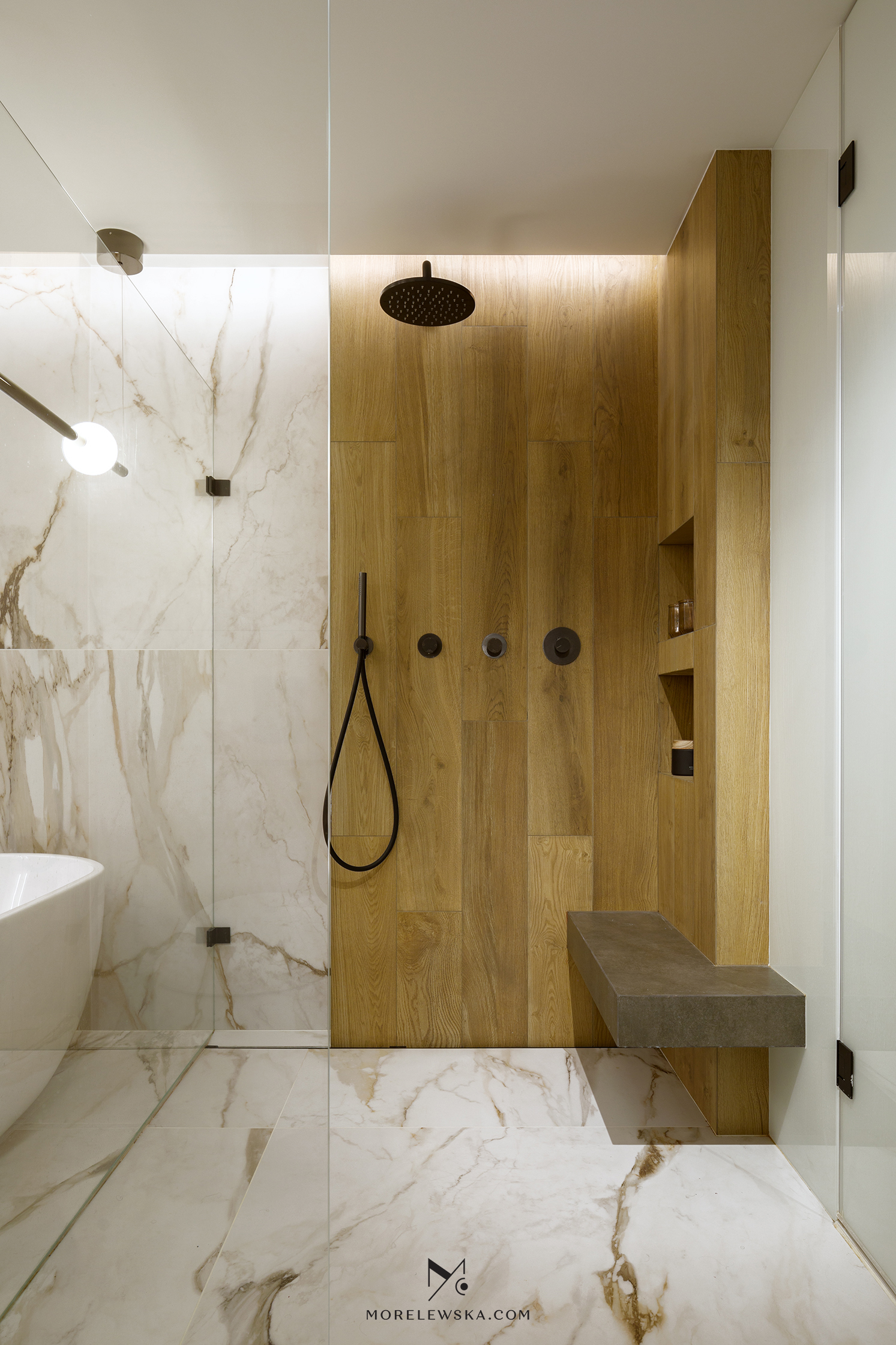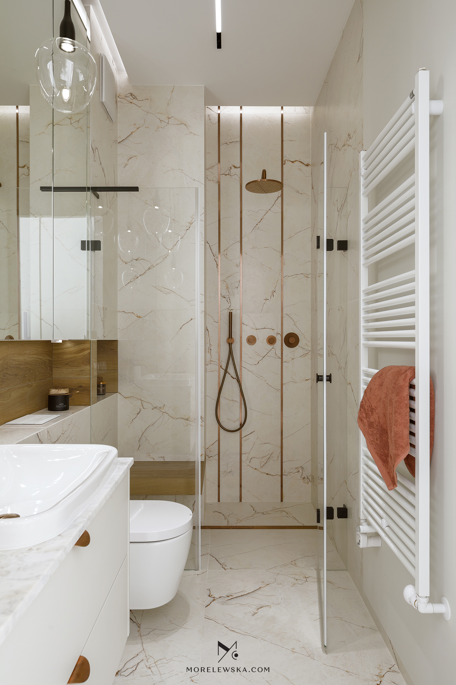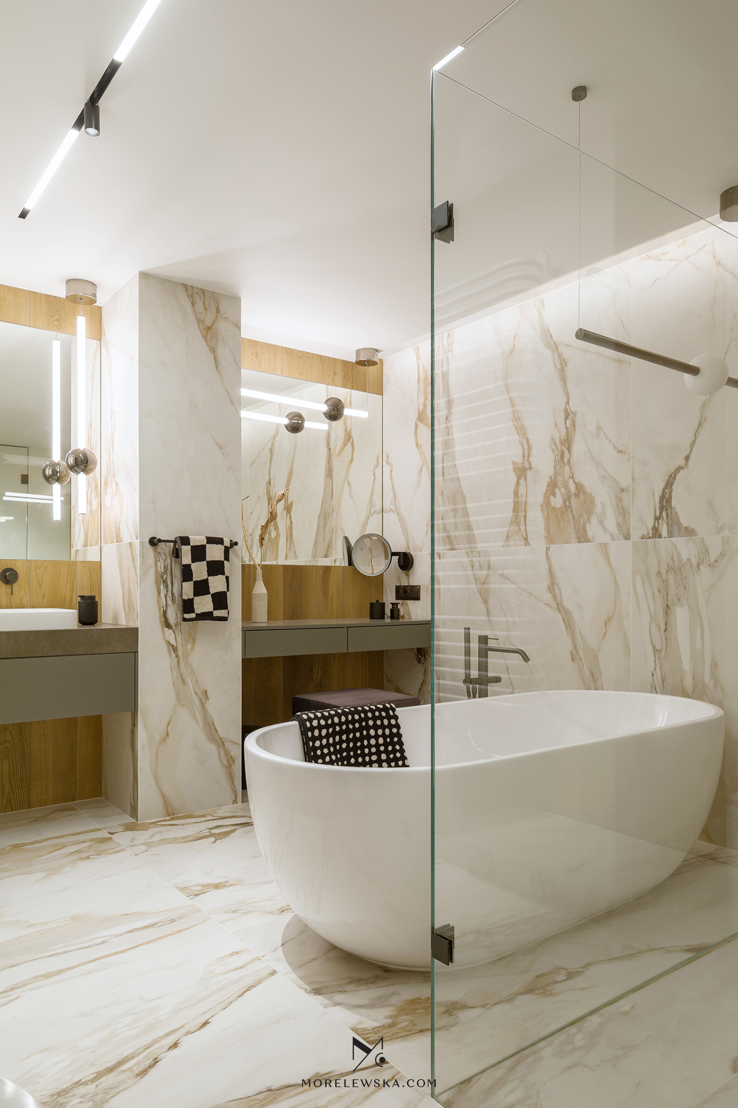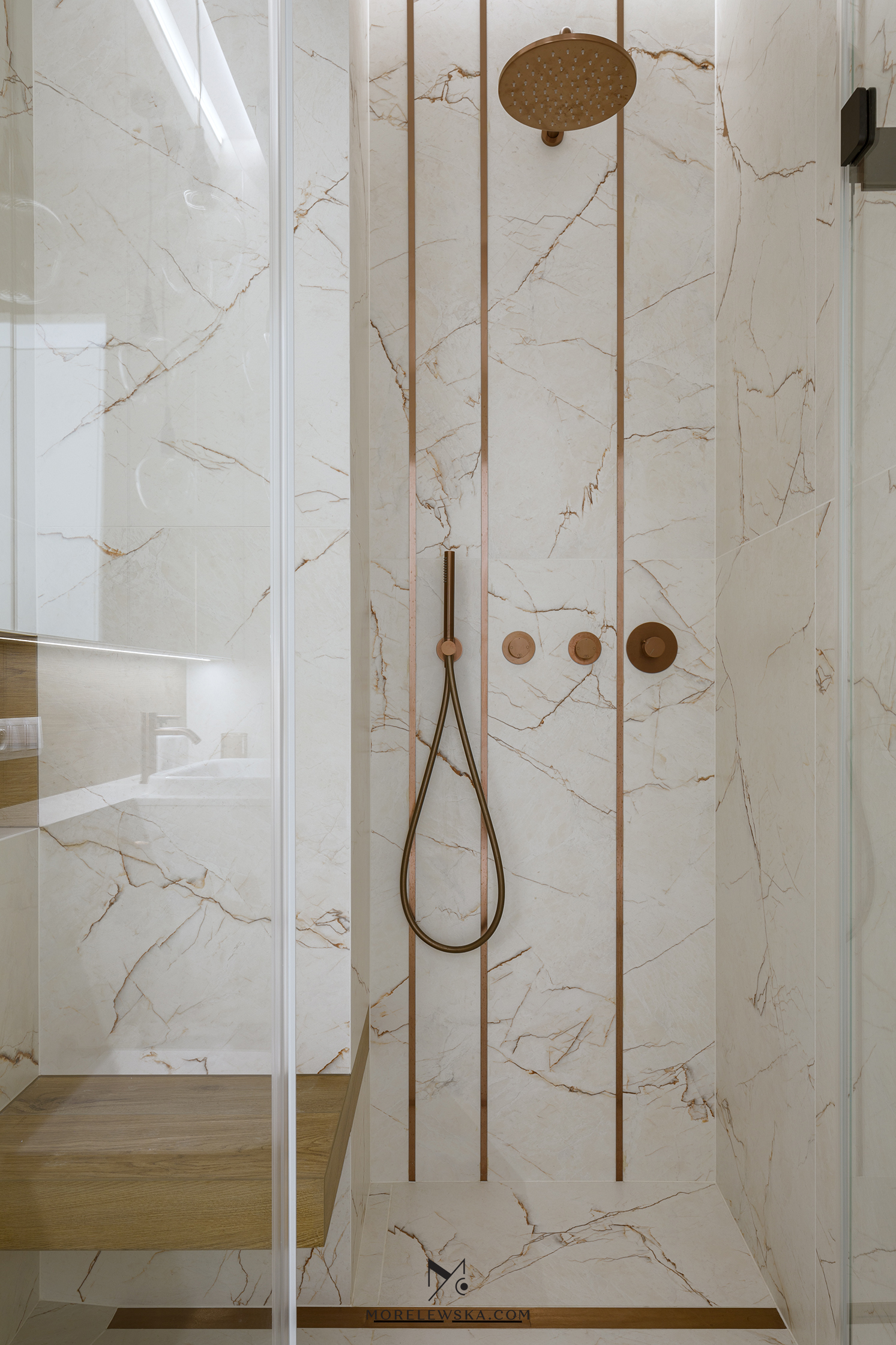 Mieszkanie na Mokotowie to przestrzeń zaprojektowana dla pary, która dużo pracuje zdalnie. Utrzymane w barwach natury z miedzianymi akcentami i kobaltowymi detalami w sypialni, łączy elegancję z funkcjonalnością. Część mieszkania, podniesiona o trzy schodki przez dewelopera, została wykorzystana do wydzielenia głównej łazienki i sporej pralni. Przejście między częścią dzienną a prywatną zaakcentowano płytami imitującymi metal, a niska półka przy podłodze stanowi element ekspozycji dla rzeźby Krzysztofa Renesa. Mieszkanie jest bogate w specjalne rozwiązania do przechowywania, takie jak przestrzeń na torby do golfa czy półki na albumy z wielu podróży inwestorów. Przestronna kuchnia z wyspą i obrotowe krzesła oraz hokery zapewniają wygodę użytkowania i sprzyjają wspólnemu spędzaniu czasu.